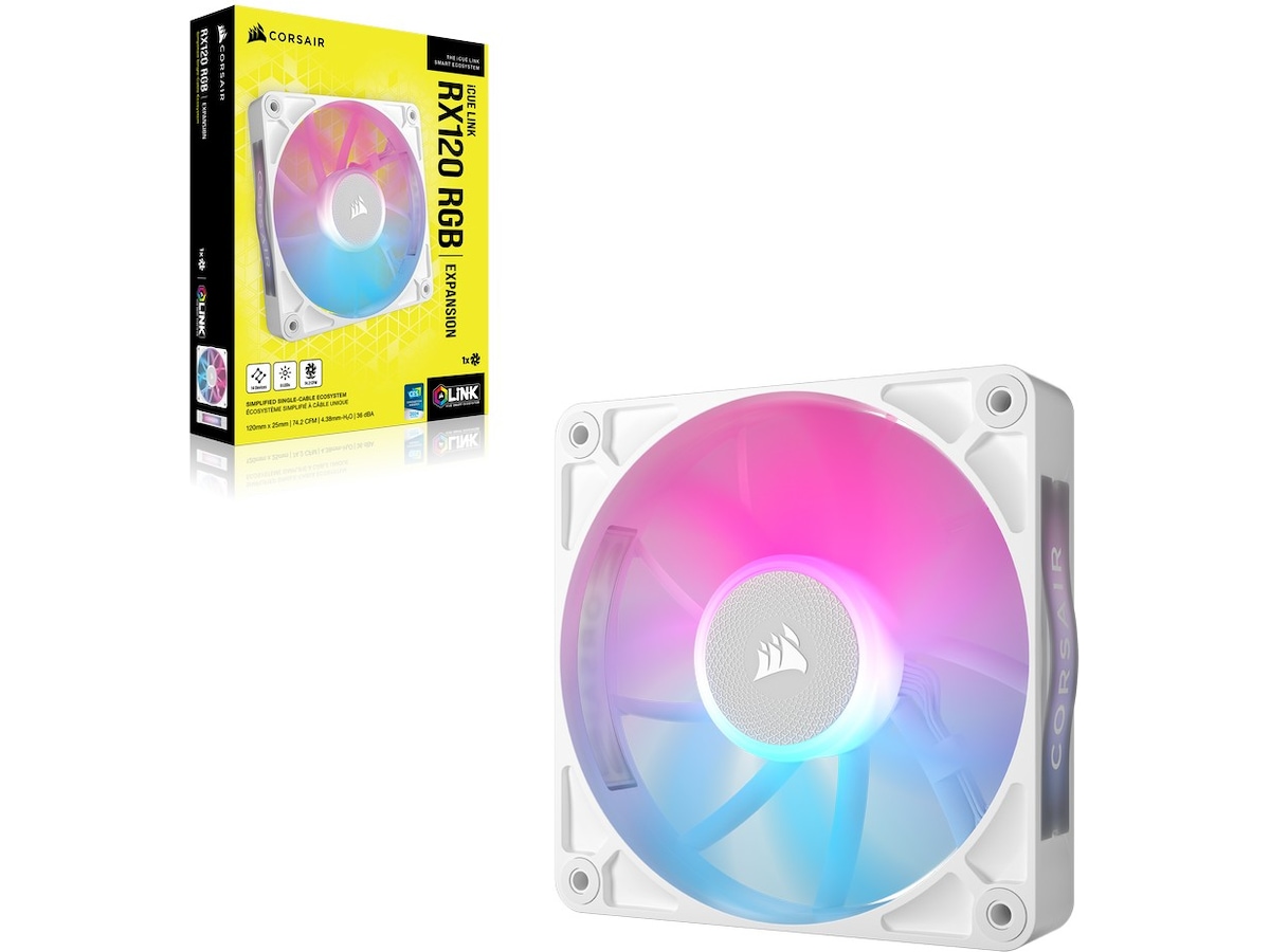 Skub forbi grænser med CORSAIR iCUE LINK RX120 RGB 120 mm PWM-blæsere, der kan prale af et højt statisk tryk på 4,38 mm-H2O for at sikre overlegen køling både med en radiator og som kabinetventilator, samtidig med at en ultra-lav støjprofil bevares. RX-blæsere har PWM-kontrollerede hastigheder via deres iCUE LINK-forbindelse, så du kan angive dine nøjagtige blæserhastigheder op til 2.100/1.700 RPM, mens luftstrømmen skubbes op til 74,2 CFM. Nyd levende belysning fra otte RGB LED'er med et gennemsigtigt vindue indbygget i siden af rammen for at give dig flere betragtningsvinkler til dine tilpassede lyseffekter. iCUE LINK patentanmeldt teknologi gør det langt hurtigere og nemmere at bygge en pc, så du nemt kan kæde alle iCUE LINK-komponenter sammen for færre kabler i dit etui end nogensinde før. Takket være dets pass-through-design kan et enkelt kabel forbinde alle RX-blæsere i dit system til den medfølgende iCUE LINK System Hub, da de medfølgende broforbindelser forbinder dine blæsere direkte til hinanden for at skabe en enkelt sømløs serie af blæsere – nej ledninger imellem. CORSAIR AirGuide-teknologi hjælper med at skubbe kuverten yderligere ved at dirigere luftstrømmen derhen, hvor der er mest brug for det, mens et proprietært magnetisk kuppelleje genererer exceptionelt lav støj uden næsten ingen friktion. Ved lave belastninger skal du helt slippe af med støjen ved at bruge nul-omdrejningstilstand. Vil du have et strejf af personlighed? En medfølgende dekorativ sideplade monteres nemt over sidevinduet for at fuldende dit systems udseende.