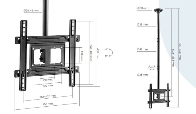 - Justerbar profil: 698 - 1568 mm (fra loftet)