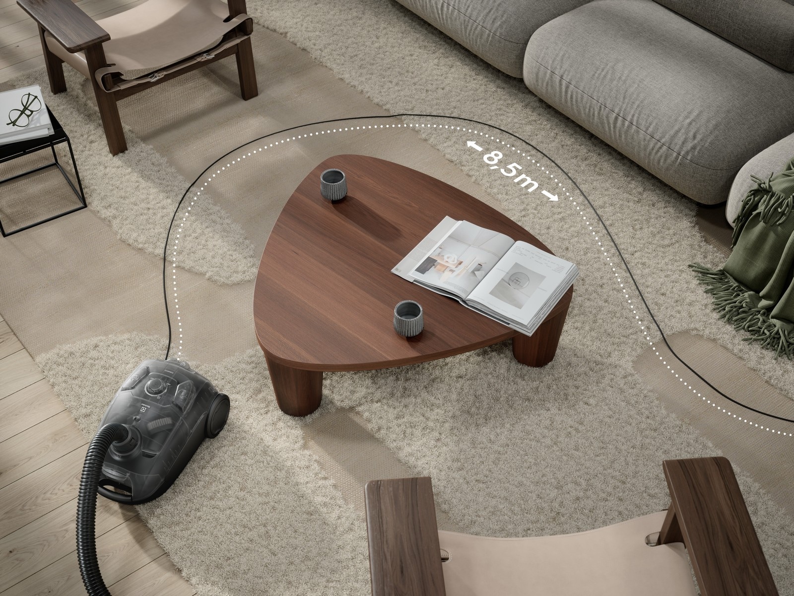 Denne ergonomiske støvsuger lader dig rengøre overflader på op til 72 m2 uden at skifte stikkontakt. Takket være teleskoprøret, de store hjul og en rækkevidde på 8,5 meter kan du nemt komme omkring og støvsuge
