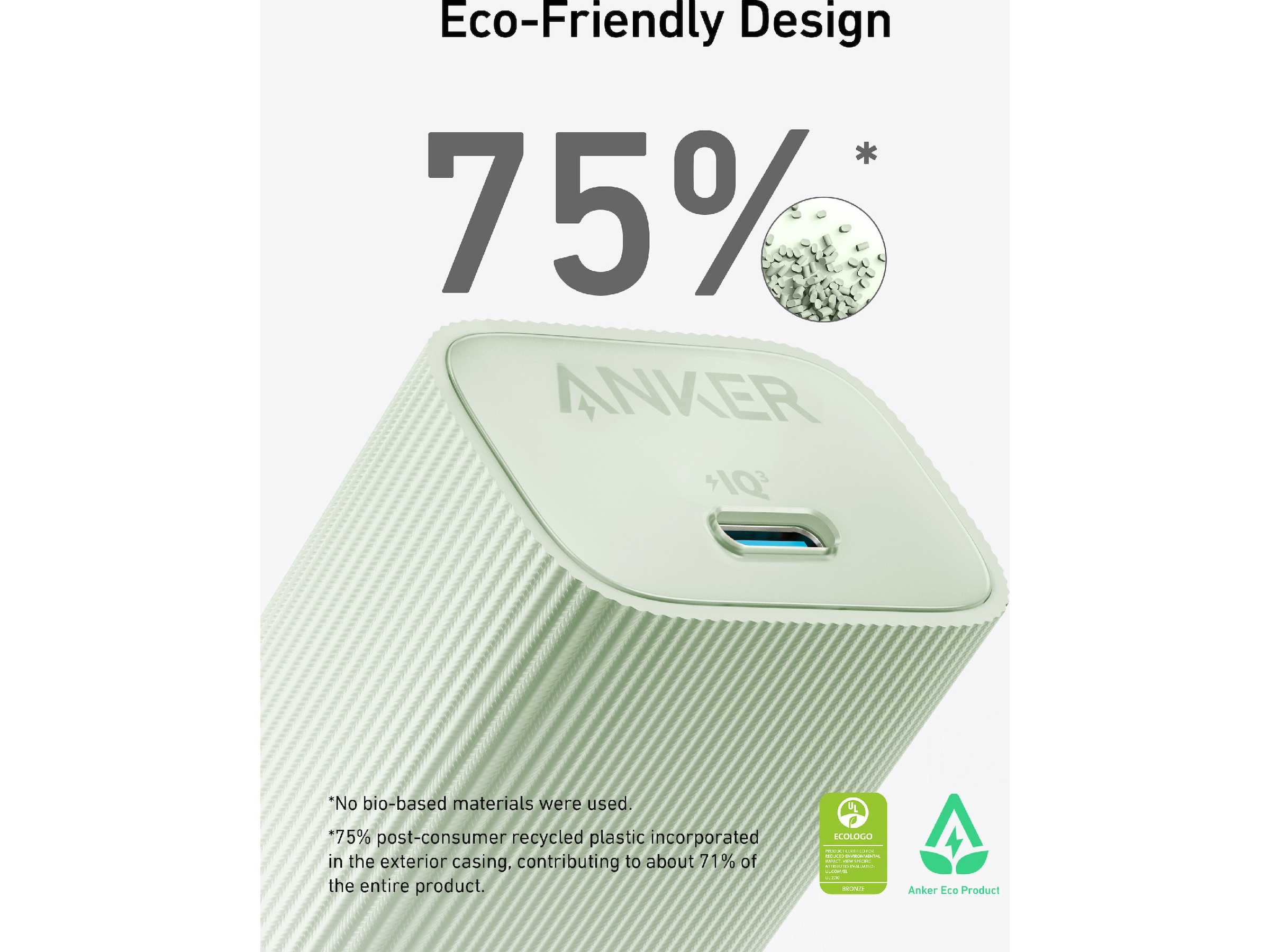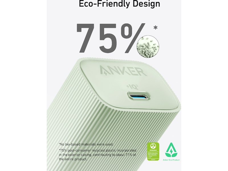 Brug af 75 % af post-consumer recycled plastic (PCR) i opladeren og papiremballagen for at reducere plastikaffald.