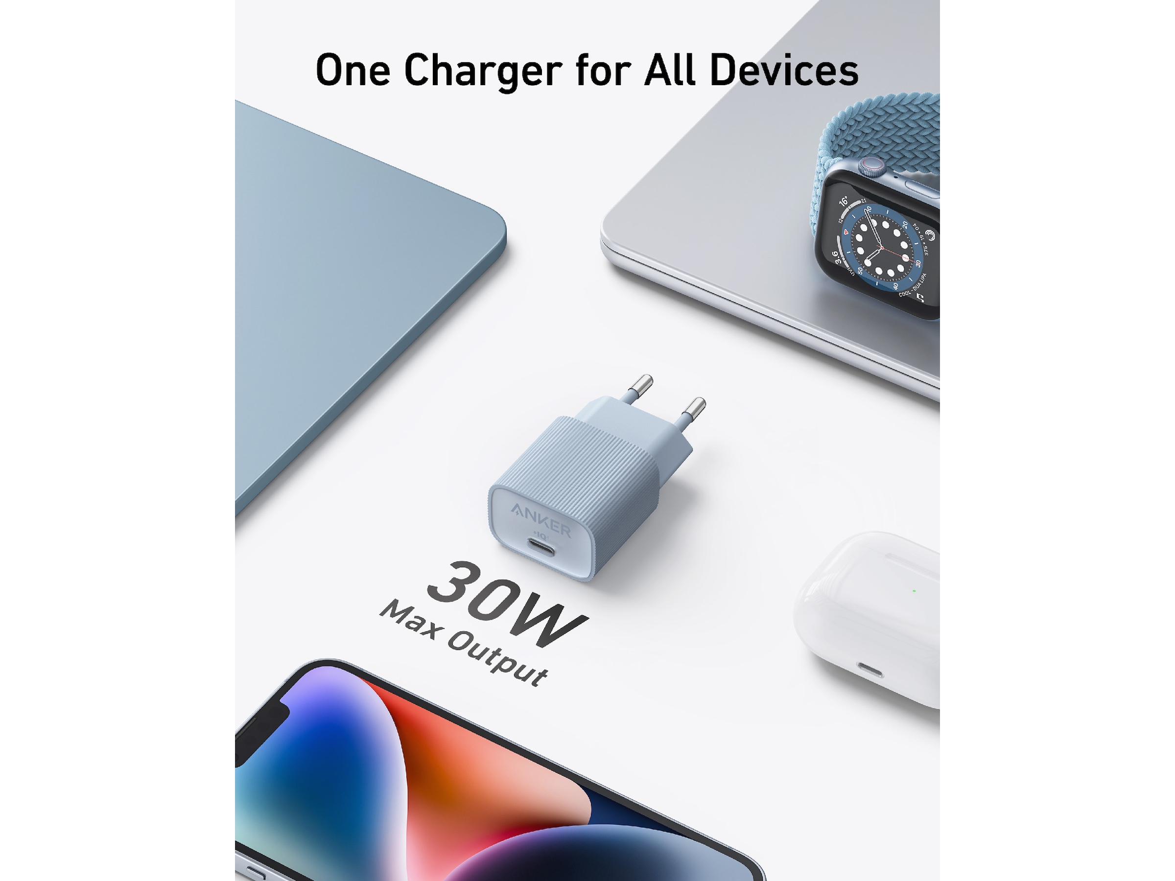 Understøtter en maks. 30W hurtigopladning, hvilket betyder, at denne oplader kan dække små eller større enheder inklusive Apple Watch, iPhone-serien, iPad, MacBook Air og mere.