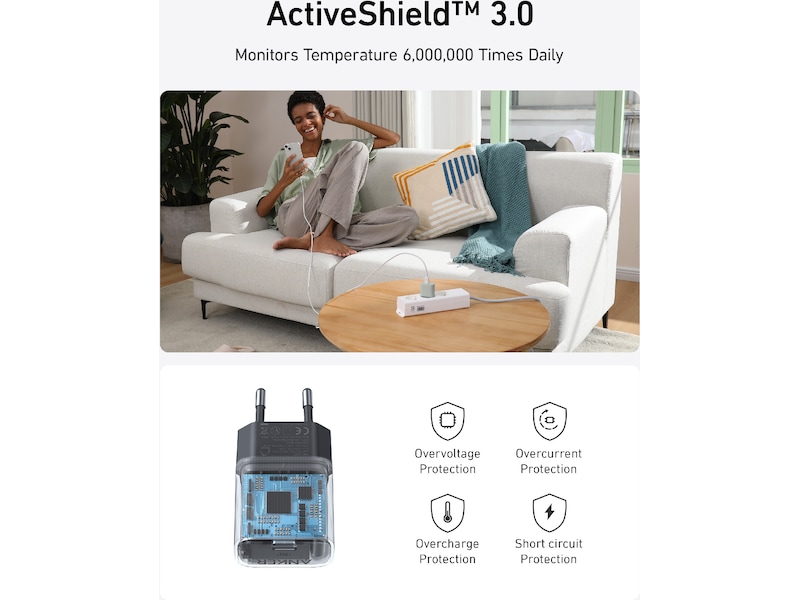 Udstyret med PowerIQ 3.0-teknologi til at levere optimeret opladning til stort set enhver mobilenhed, inklusive telefoner, tablets og bærbare computere. Understøtter også Programmerbar strømforsyning (PPS) for kompatibilitet med Samsung Super Fast Charging.