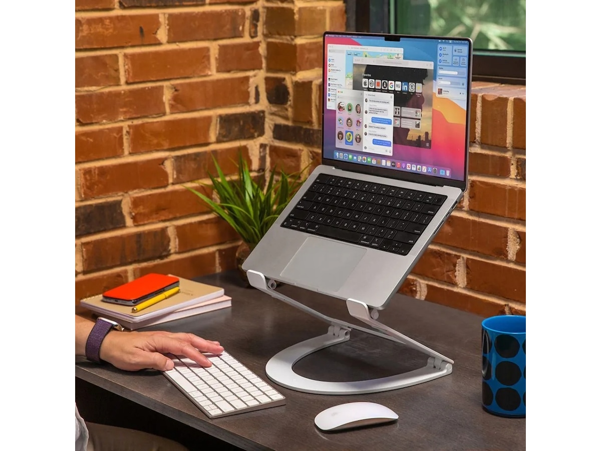 Curve Flex hæver din MacBook-skærm op til 22 tommer høj, så dit MacBook-kamera er i øjenhøjde til videoopkald. Har du en opsætning med to skærme? Curve Flex har rækkevidden til at justere din MacBook-skærm med eksterne skærme som den 27-tommer Apple Studio-skærm.