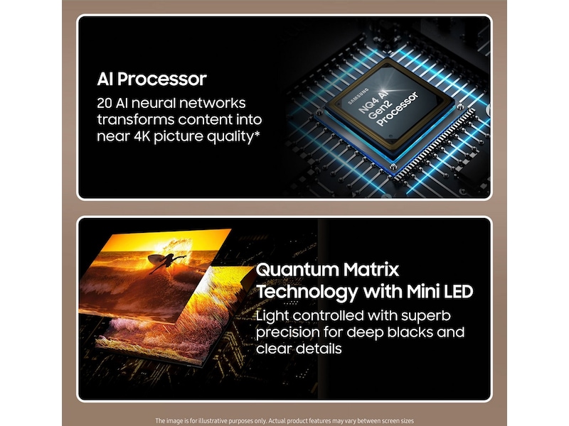 Neo QLED og Quantum Matrix Technology anvender mini-LED-lyskilder for at opnå fantastisk præcision i nuancer og kontraster. Den kunstige intelligens tilpasser også indholdet, så du kan glæde dig over klare farver og dyb kontrast, selv på lyse sommeraftener.