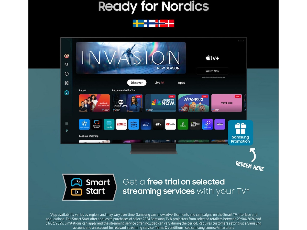 *Gælder ved køb af udvalgte Samsung TV-modeller fra 2024 og udvalgte projektorer på samsung.com og hos udvalgte forhandlere i perioden fra 29.04.2024 til 31.03.2025. Der kan være begrænsninger, og udvalget af inkluderede streamingtjenester kan variere i kampagnens løbetid. Kræver Samsung-konto og oprettelse af en konto hos den pågældende streamingtjeneste. Læs vilkårene på samsung.com/dk/smartstart.