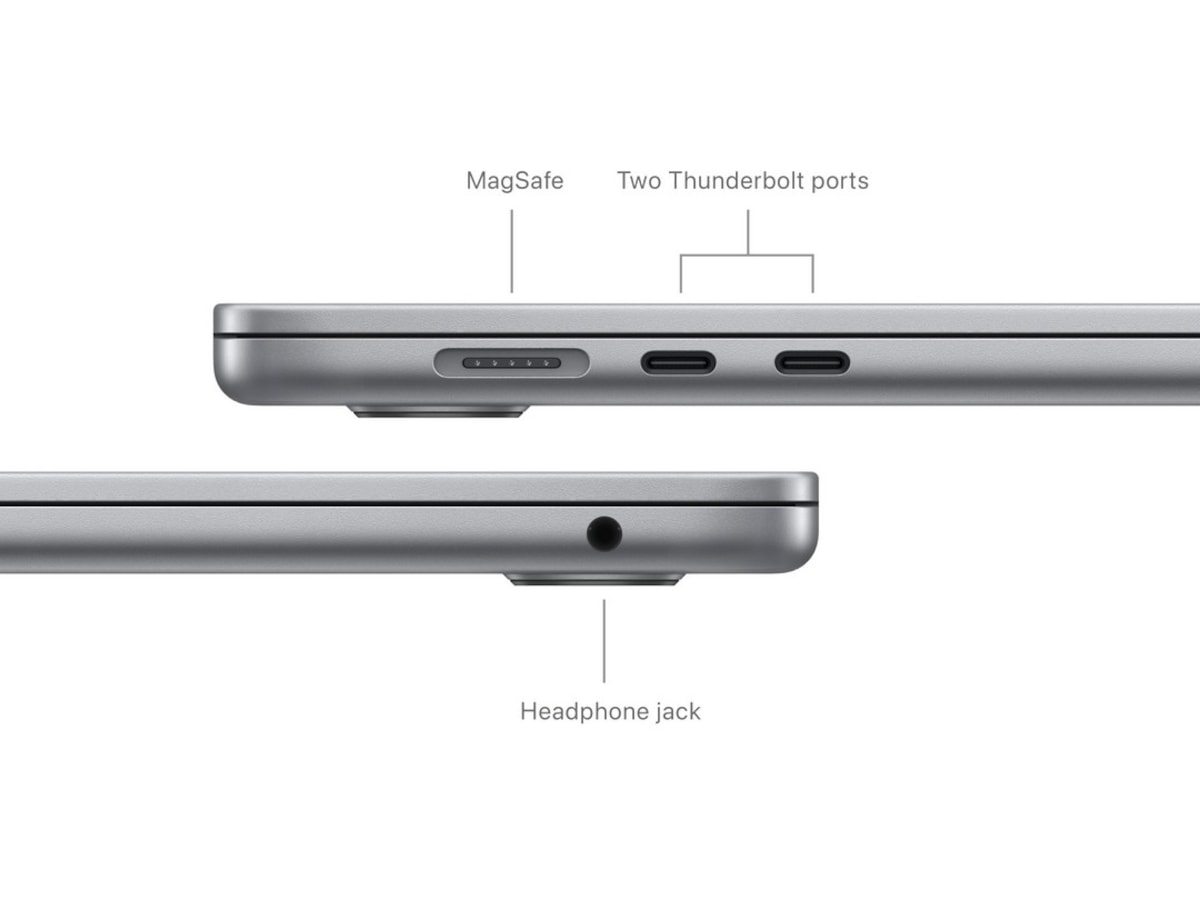 - FULDSTÆNDIG TILSLUTET – MacBook Air har to Thunderbolt-porte, et hovedtelefonstik, wifi 6E,(4) Bluetooth 5.3 og en MagSafe-opladningsport. Tilslut op til to eksterne skærme med maskinen lukket.