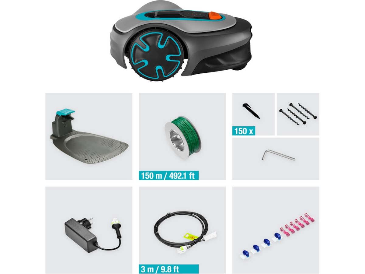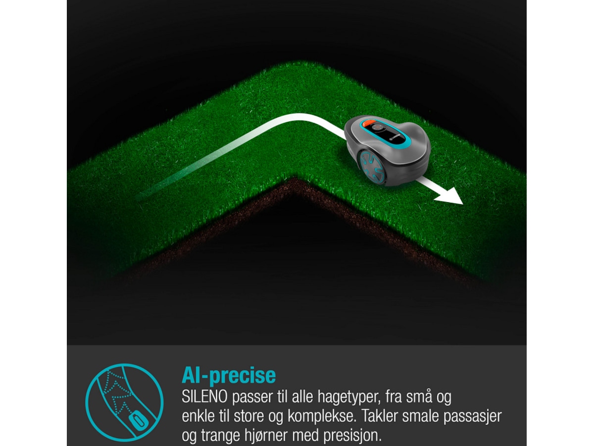 GARDENA SILENO minimo klipper små og komplekse plæner helt automatisk, pålideligt og jævnt. Den klarer smalle passager og snævre hjørner uden problemer. Ladestationen kan placeres meget fleksibelt uden problemer.