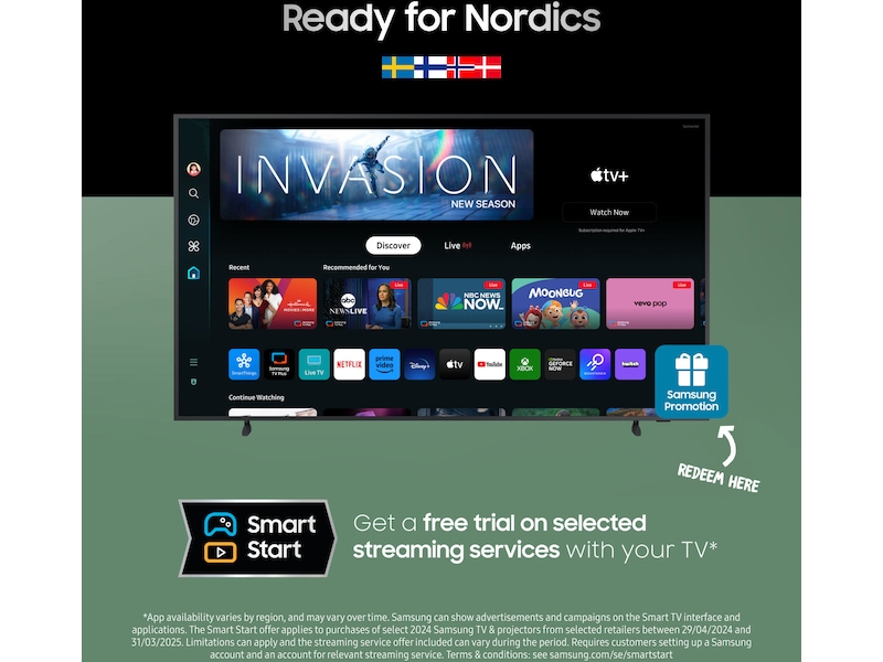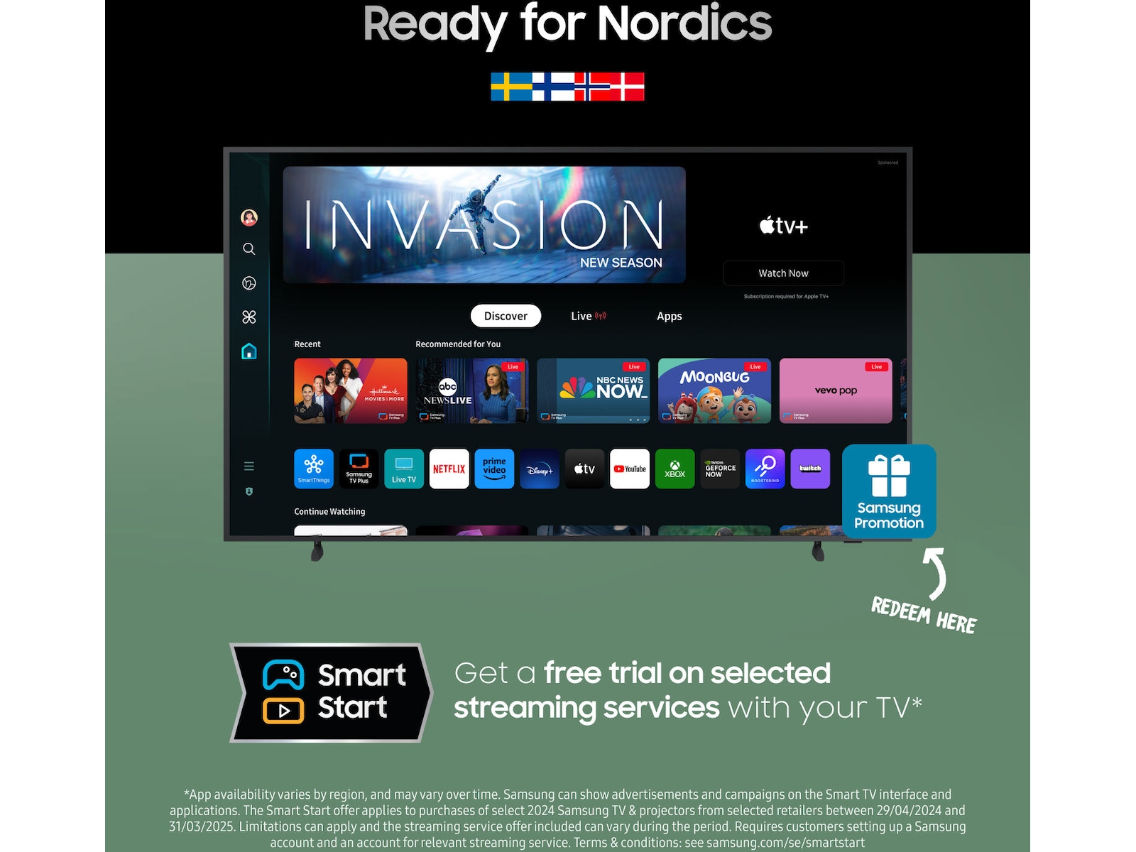 *Gælder ved køb af udvalgte Samsung TV-modeller fra 2024 og udvalgte projektorer på samsung.com og hos udvalgte forhandlere i perioden fra 29.04.2024 til 31.03.2025. Der kan være begrænsninger, og udvalget af inkluderede streamingtjenester kan variere i kampagnens løbetid. Kræver Samsung-konto og oprettelse af en konto hos den pågældende streamingtjeneste. Læs vilkårene på samsung.com/dk/smartstart.