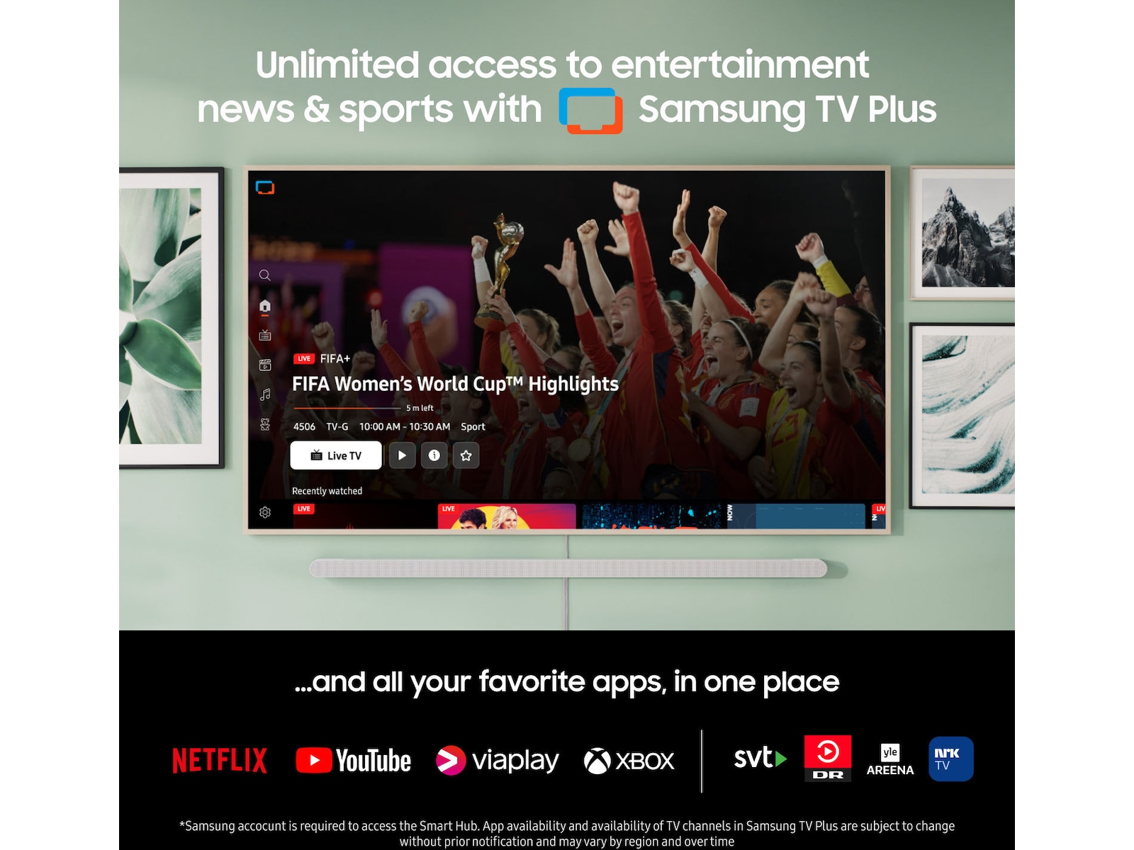 *Udvalget af apps og tjenester varierer over tid, fordi gamle kan blive fjernet, og nye kan blive tilføjet. Visse apps og tjenester kræver abonnement eller engangskøb for at kunne bruges. Samsung kan vise reklamer og kampagner på Smart TV-grænsefladen og i apps. Skærmspejling fungerer kun, når TV'et og mobilen er tændt og forbundet til samme Wi-Fi-netværk. Apple og AirPlay er varemærker tilhørende Apple Inc., registreret i USA og andre lande og regioner. AirPlay kræver iOS 12.3 eller nyere eller macOS 10.14.5 eller nyere.