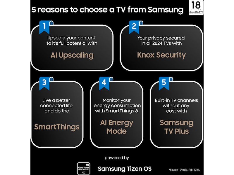 *Gælder ved køb af udvalgte Samsung TV-modeller fra 2024 hos udvalgte forhandlere. Garantien gælder i 10 år fra købsdato. Kræver kopi af købskvitteringen samt registrering på Samsungs websted senest 90 dage efter køb. Gælder ved køb foretaget til og med den 31. marts 2025 af udvalgte TV-modeller fra 2024. www.samsung.com/dk/offer/offline/screen-burn-warranty/