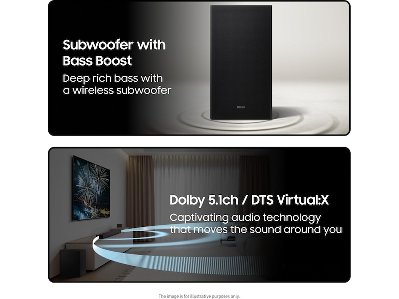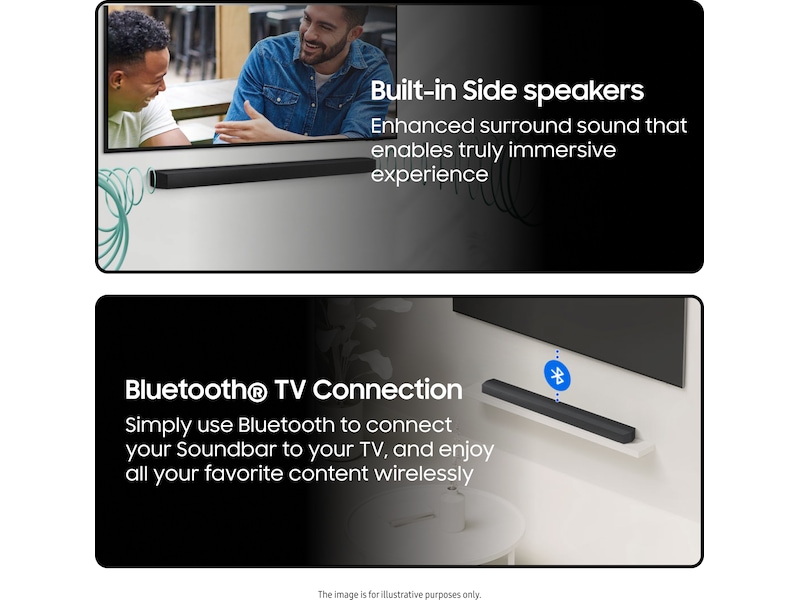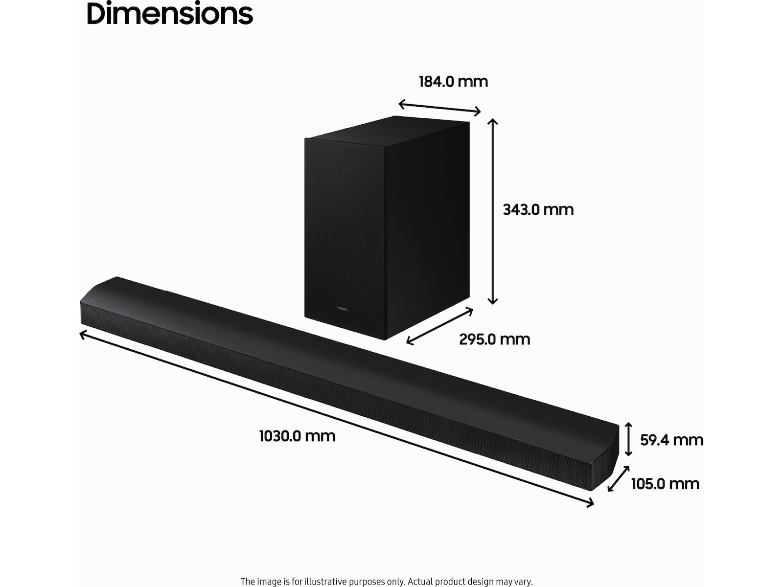 | Dimensioner (B x D x H) / Vægt detaljer | Lydbar: 103 cm x 10.5 cm x 5.94 cm / 3.2 kg, Subwoofer: 18.4 cm x 29.5 cm x 34.3 cm / 5 kg |