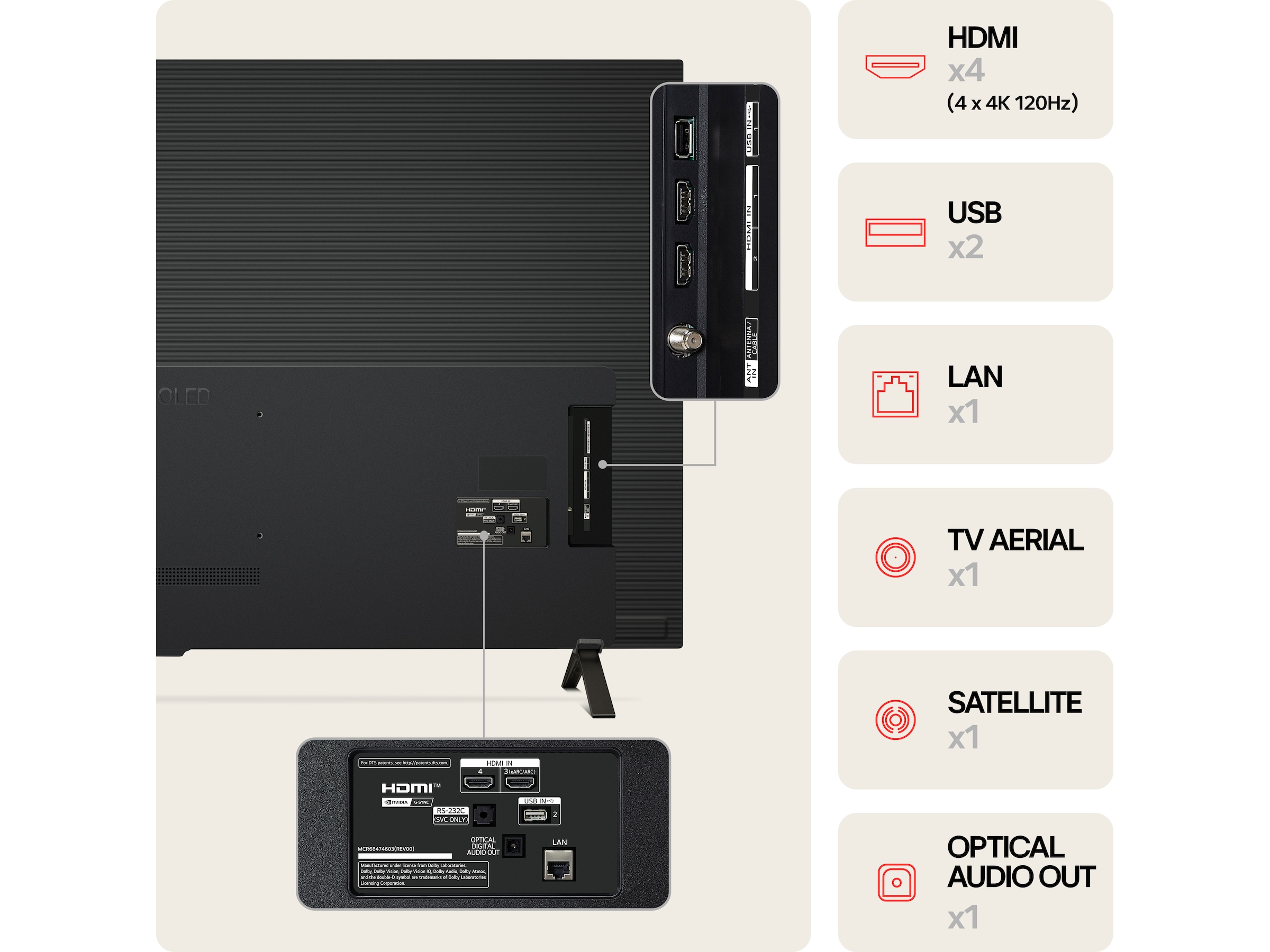 | Egenskaber | AI Concierge, Freesync, USB-webcamsupport, AI Genre Selection, Always Ready, Family Settings, AI Brightness Control, 4K High Frame Rate (HFR), AI Picture Wizard, G-SYNC Compatible, Game Dashboard, Apple AirPlay 2 support, Cloud Gaming |