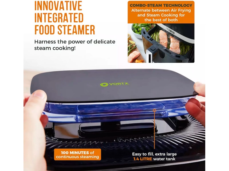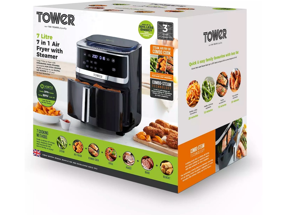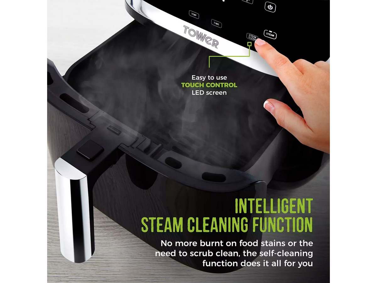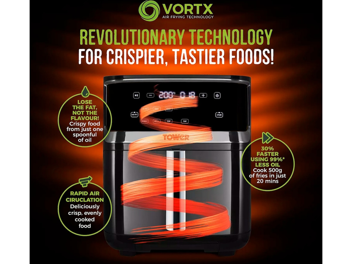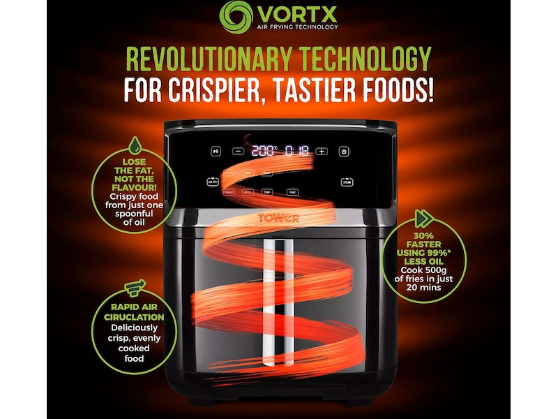 Tilberedning af mad 30 % hurtigere, Tower Steam Air Fryer bruger mindre strøm end konventionelle ovne. Spar op til 50 % på din energi ved blot at skifte til madlavning med dampluftfriture.