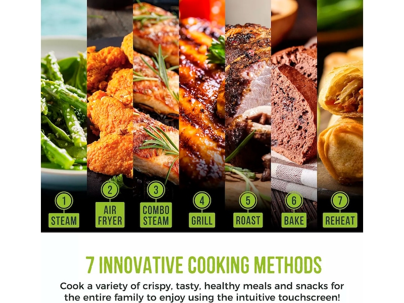 Airfry, damp eller bekvemt kombineret madlavning ved at bruge luftstegning og dampning på samme tid. Yderligere funktioner omfatter genopvarmning og damprensning.