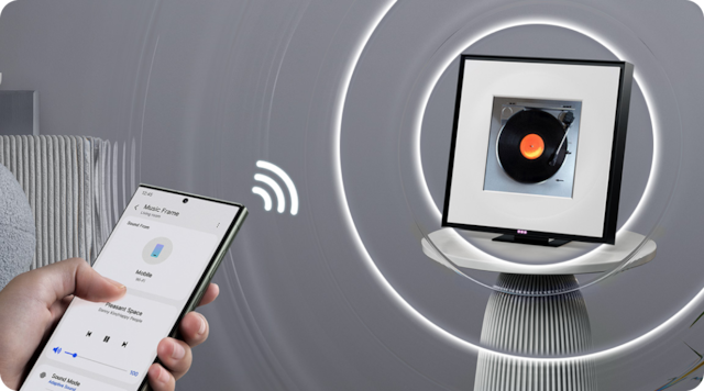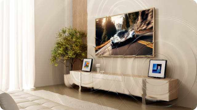 TV og Music Frame fungerer i perfekt harmoni. TV’ets højttalere samarbejder med din Soundbar om at skabe en større lydoplevelse.*