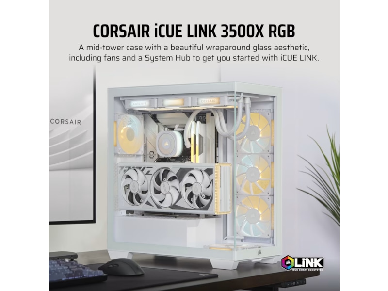 CORSAIR iCUE LINK 3500X RGB Mid-Tower Glass PC Case kombinerer bruger-venlige funktioner med en fantastisk indpakning af glas æstetik og tre forudinstallerede iCUE LINK RX120 RGB fans.