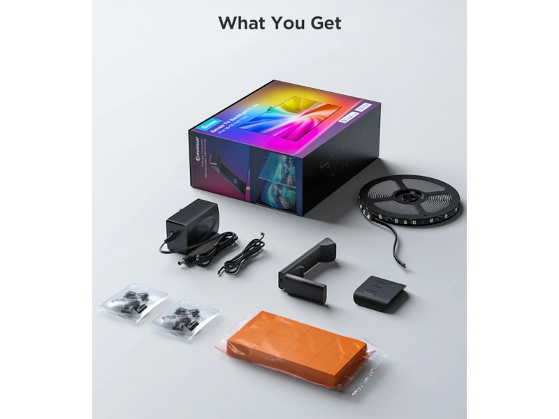 Govee Envisual-teknologi, 55" - 60" TV-kompatibel, Tyngdekraftophængningsstruktur, DreamView Syncing-teknologi, Detektering af blank skærm, Fisheye-korrektion, Fjernelse af letterbox, Tilpasning til ultratynde tv'er |