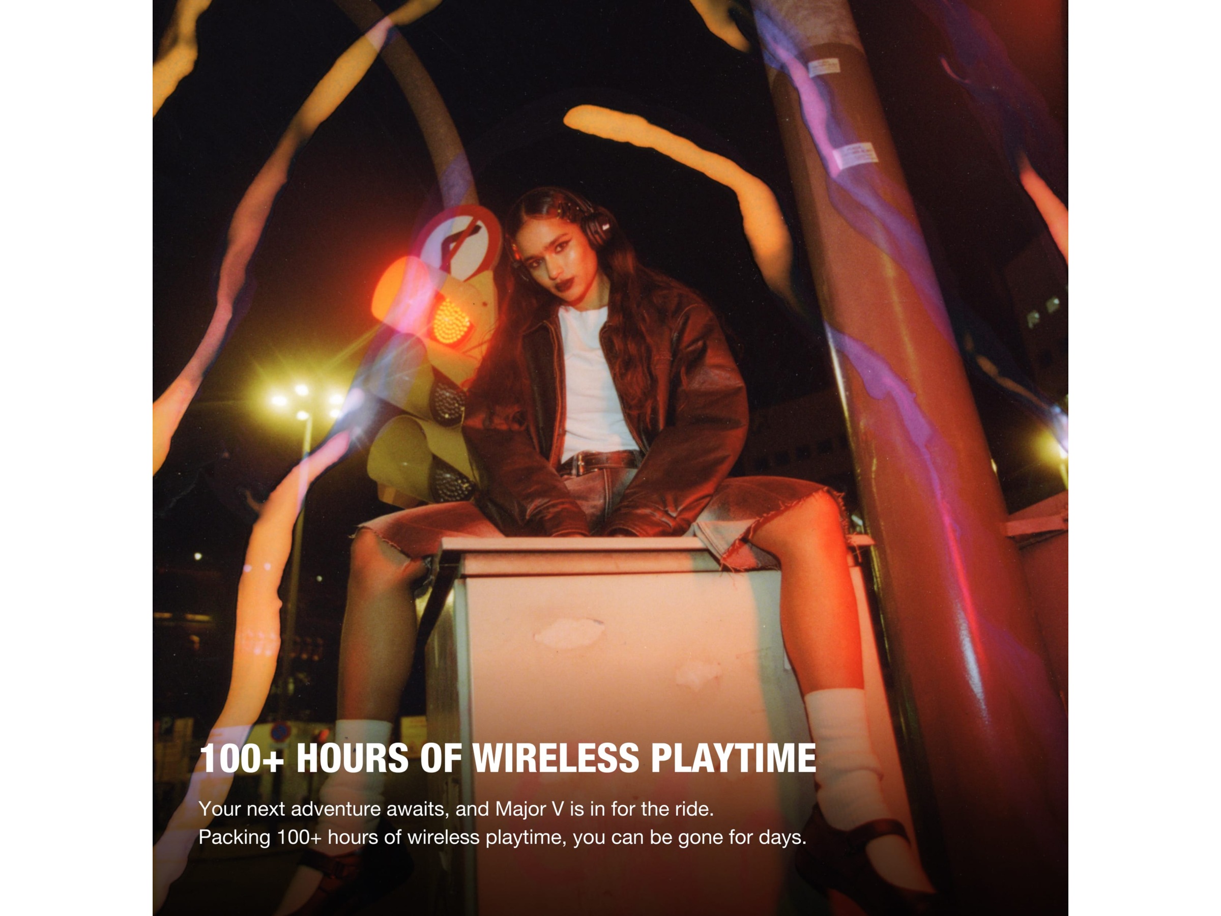Med over 100 timers trådløs afspilning kan du være væk i dage og aldrig være uden en lydside. Major V kan oplades med den hurtige opladningsmulighed, så du hurtigt kan dykke tilbage i sessionen.