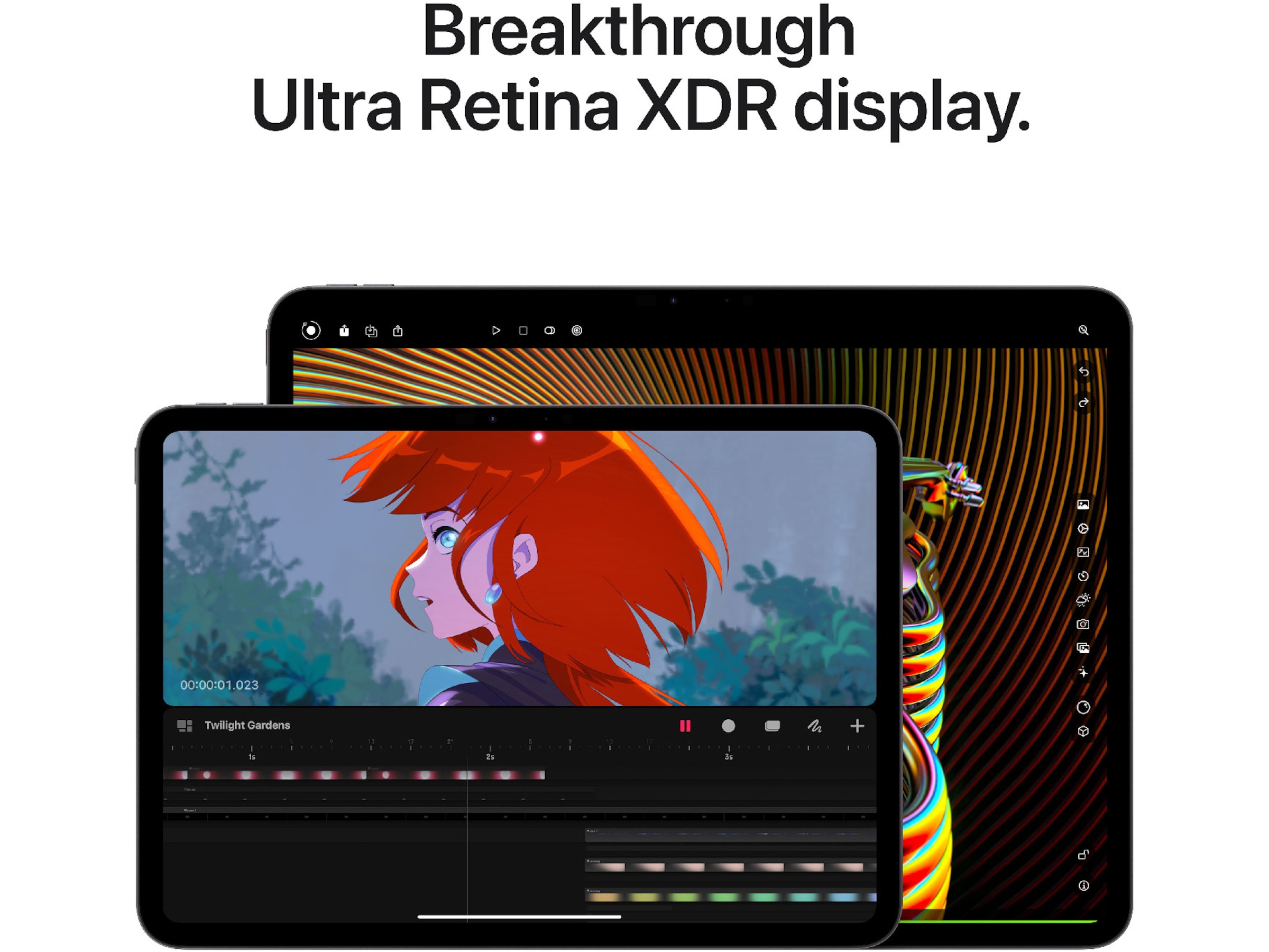 Op til 10⁃-core CPU i M4-chippen giver banebrydende ydeevne. Den 10-kernede GPU sikrer lynhurtig grafik. Med et batteri til hele dagen kan du gøre alt, hvad du kan forestille dig på iPad Pro. 4 Og med op til 2 TB lagerplads kan du gemme alt fra apps til store filer, såsom 4K-video. 5