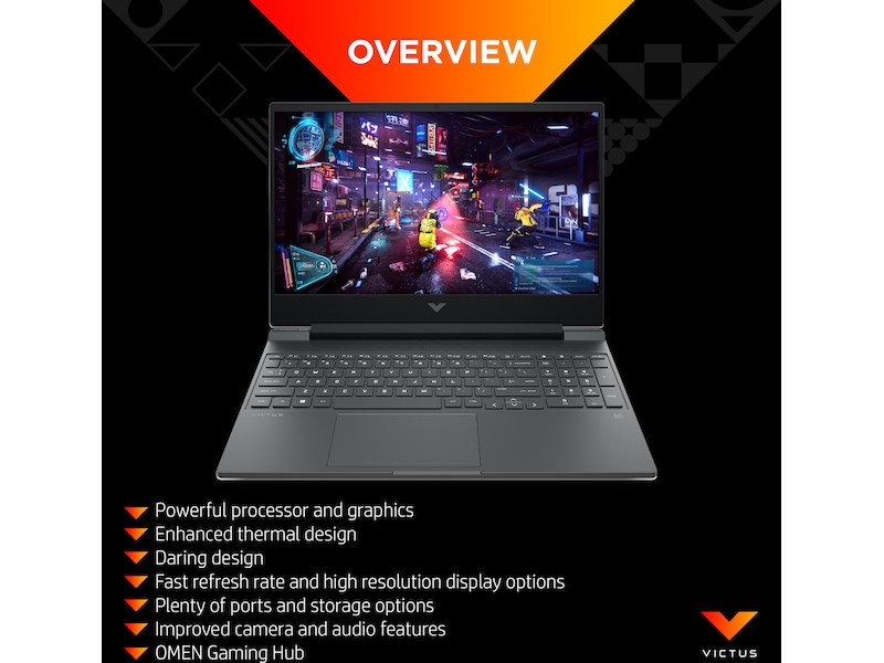HP Victus-laptop er skabt til formidabelt pc-gaming. Denne elegante maskine omfatter en 12. generations Intel® Core™-processor og et moderne grafikkort. Laptoppen har et imponerende design og hardware med masser af farvemuligheder , opdateret termisk design, et gaming-tastatur med alle taster og et HD-kamera med temporal støjreducering.