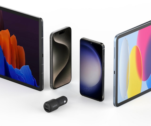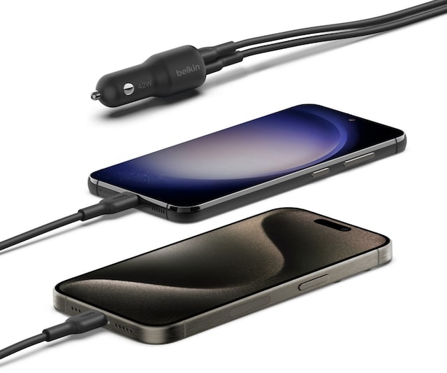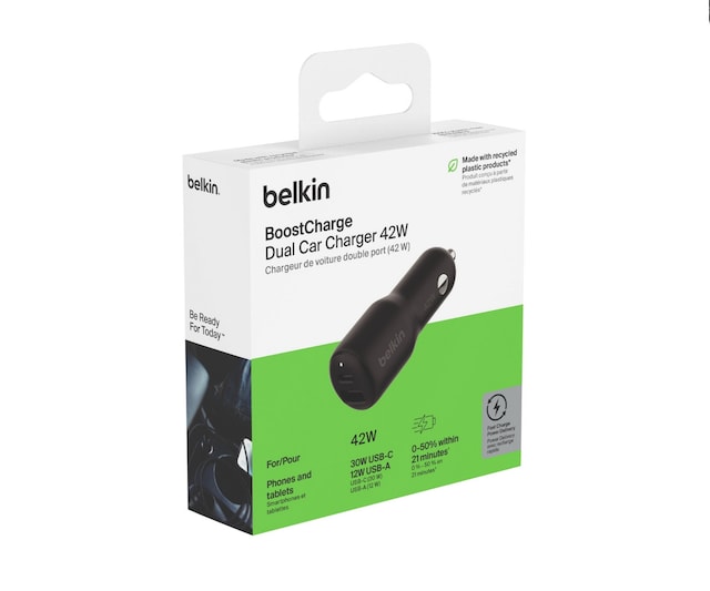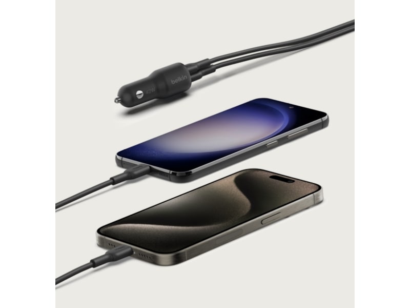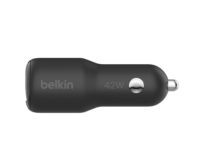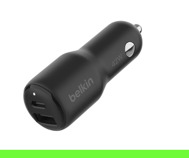 Oplad hurtigt en iPhone eller Samsung-smartphone, mens du oplader en anden enhed på samme tid med vores dobbelte biloplader på 42 W med PPS. De to porte er henholdsvis en 30 W USB-C-port og en 12 W USB-A-port. Denne kompakte biloplader er i et elegant, gennemtænkt design til enhver bil og har 2 porte til opladning under kørsel. Leveres med opladeren alene.