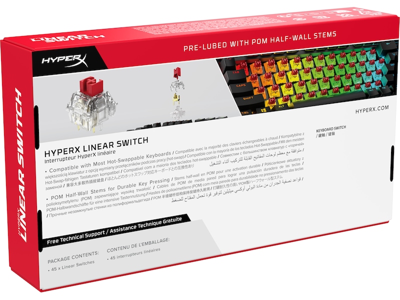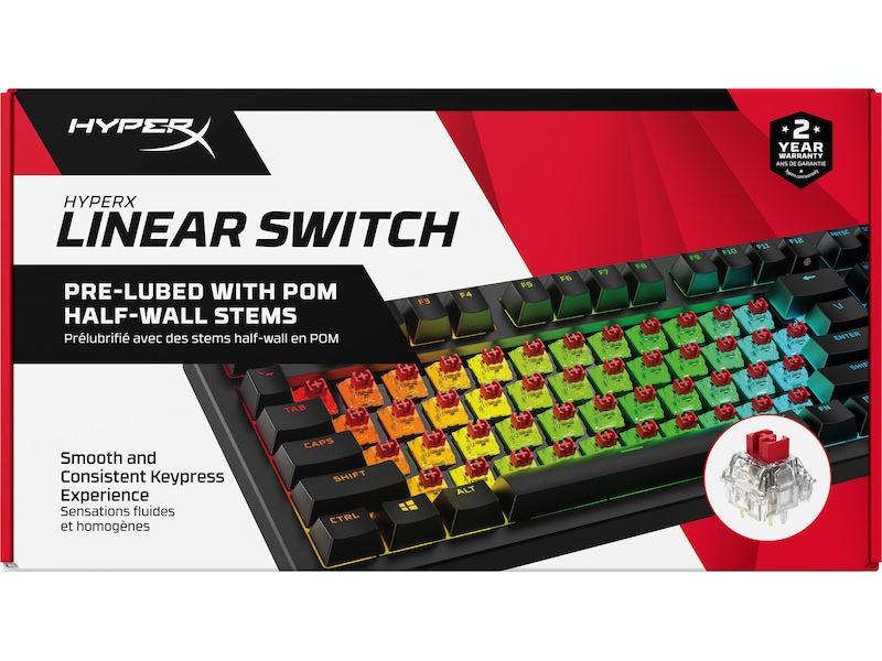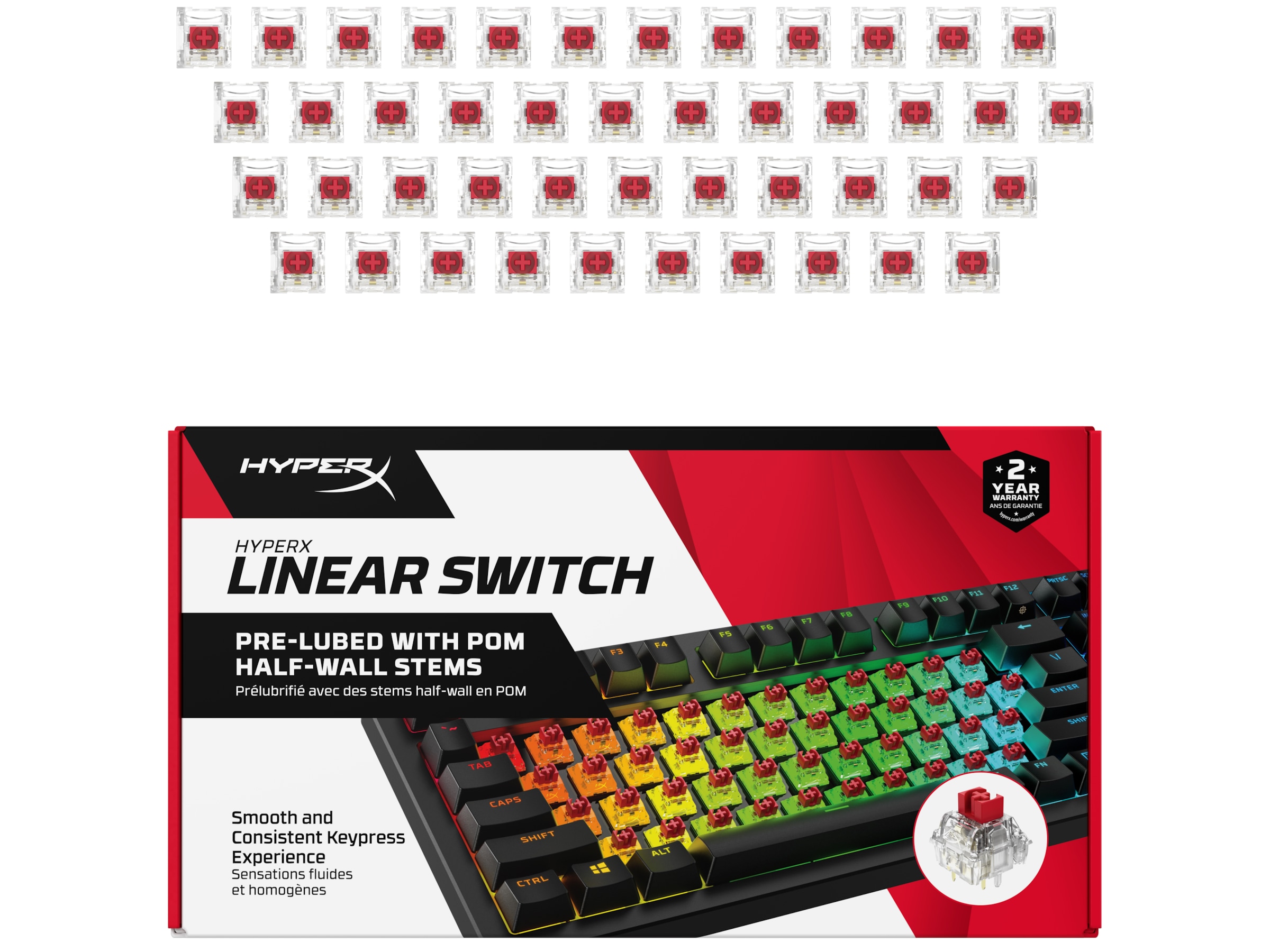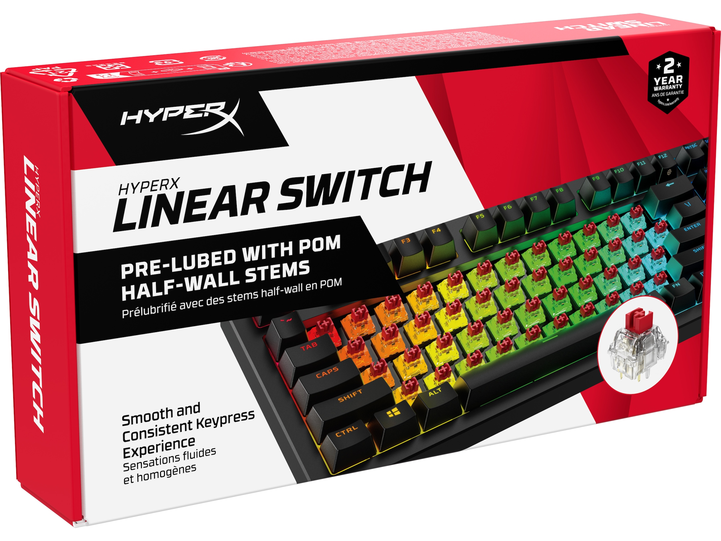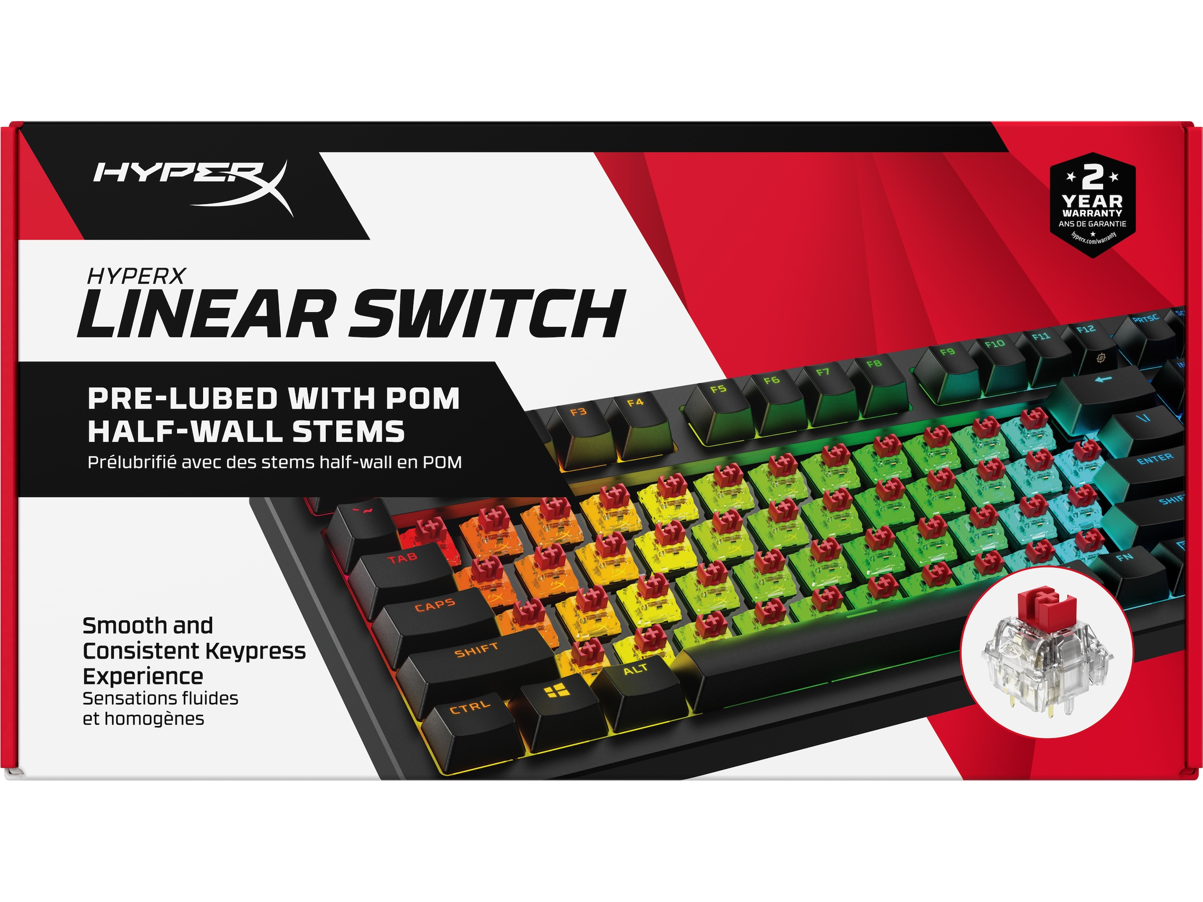 HyperX Linear Switches er tastaturkontakter, der bygger videre på vores røde switches' succes og forfiner dem til en mere smidig og alsidig løsning. Disse 5-pins switches er kompatible med de fleste 5-pins hot-swappable tastaturer, så selv hvis du ikke har et HyperX-tastatur, kan du stadig nyde fordelene ved disse højtydende switches. HyperX Linear Switches har halv-væg stammer, som øger tastestabiliteten ved hurtige tryk eller i pressede situationer. Switchene leveres forsmurte, så du kan nyde glatte, stille og responsive tastetryk lige fra pakken. De er bygget til at holde, med en slidstærk nylonbase til at understøtte fjeder, blad og stamme samt en krystalklar polycarbonattop. Disse pålidelige switches er vurderet til en levetid på op til 80 millioner tastetryk.