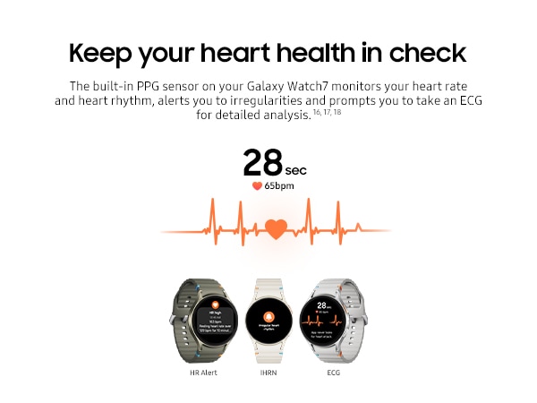 Den indbyggede PPG-sensor på din Galaxy Watch7 overvåger din puls og hjerterytme, advarer dig om uregelmæssigheder og beder dig om at tage et EKG for detaljeret analyse.