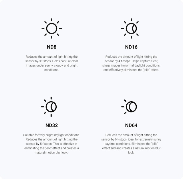 - Indeholder ND8, ND16, ND32 og ND64 filtre til forskellige niveauer af lysreduktion.