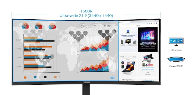 Det ultrabrede 21:9-panel giver 35 % mere plads på skærmen end Full HD-skærme af en lignende størrelse, hvilket gør multitasking mere behageligt og effektivt. 1.500R panelkrumning sikrer, at hvert punkt på den buede skærm er lige langt fra dine øjne, så du får en behagelig seeroplevelse.