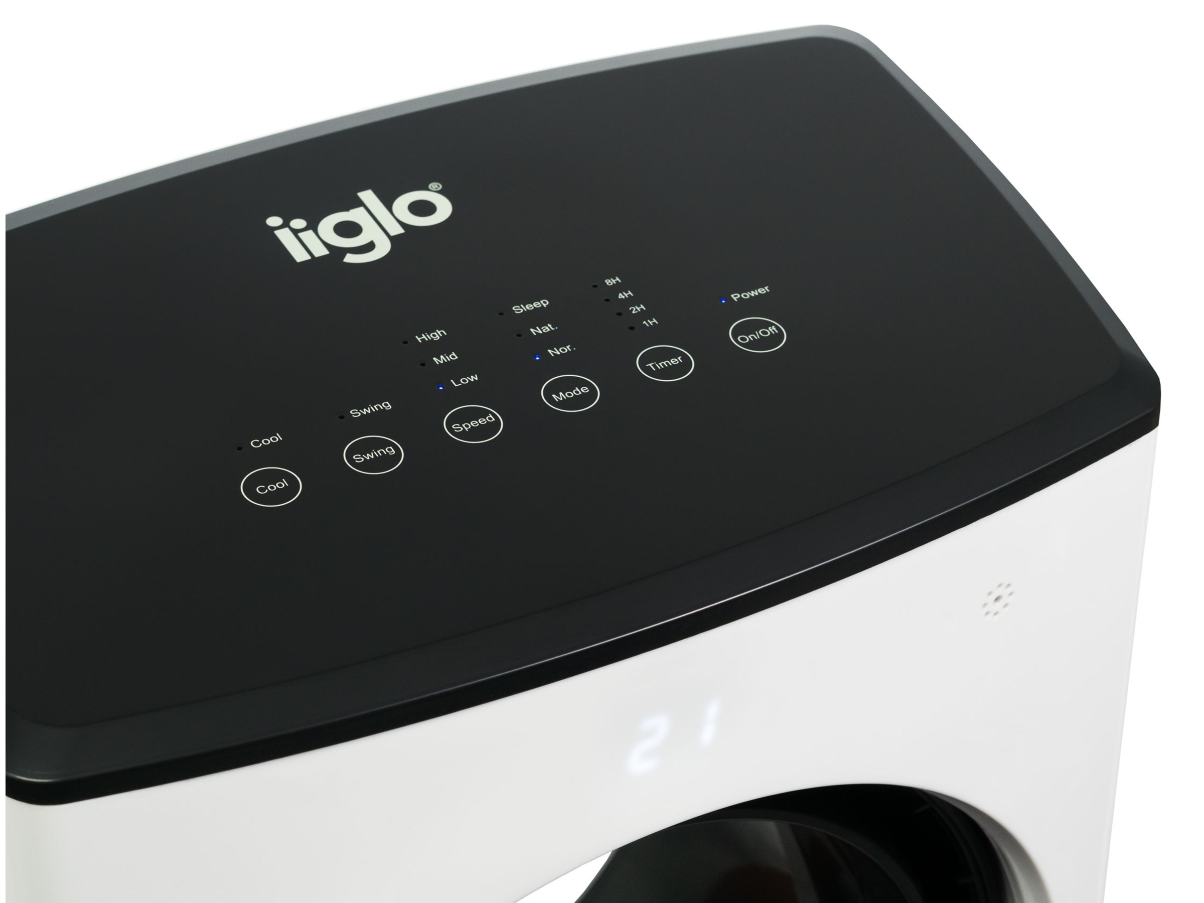 iiglo-luftkøleren er bladløs og har et kontrolpanel på toppen, som gør den nem at bruge. Der følger også en fjernbetjening med, så du kan betjene den på afstand, hvis du f.eks. ligger behageligt i sofaen og vil ændre indstillingerne.