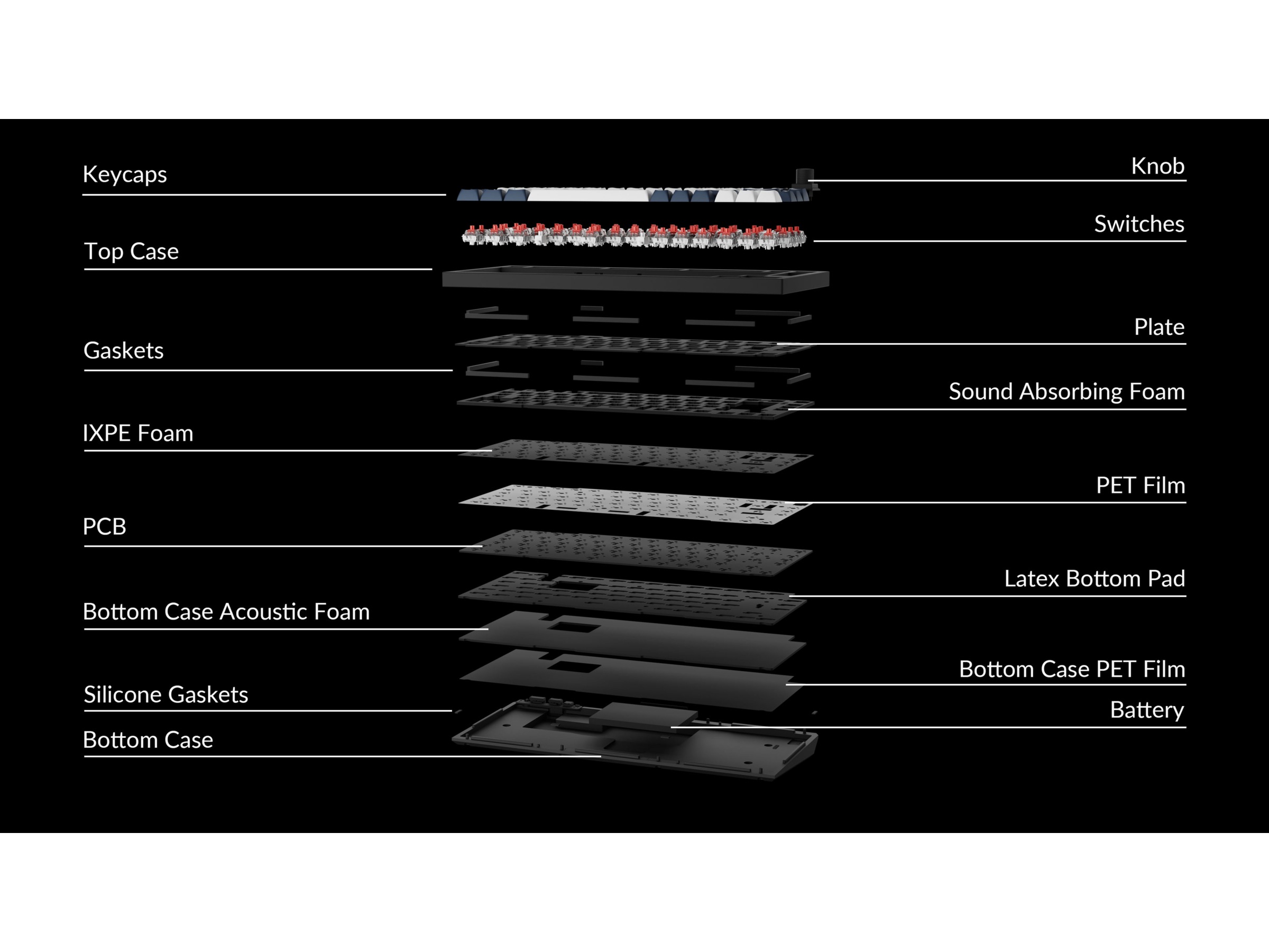The Double Gasket Design is a new innovative structure in the industry. In addition to the gaskets on the plates, we added silicone pads between the top and bottom cases to significantly reduce the acoustic resonance between the metals and reduce the noise of the impacted metals.