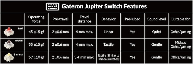 Our exclusive Gateron Jupiter mechanical switch (for the Fully Assembled version only) comes with a 3-pin design, its pre-lubed with a reliable Gateron quality standard with up to 80 million keystrokes lifespan. While their unique LED diffuser design offers high RGB backlight transmittance and softer backlight effect.
