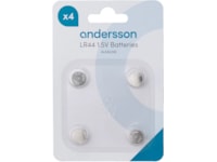 Andersson LR44 er et lille, langtidsholdbart knapcellebatteri, der bruges i fjernbetjeninger, ure, termometre, lommeregnere, Game & Watch-spil og mere. Denne pakke indeholder fire LR44 1,5 volt alkaliske knapcellebatterier.