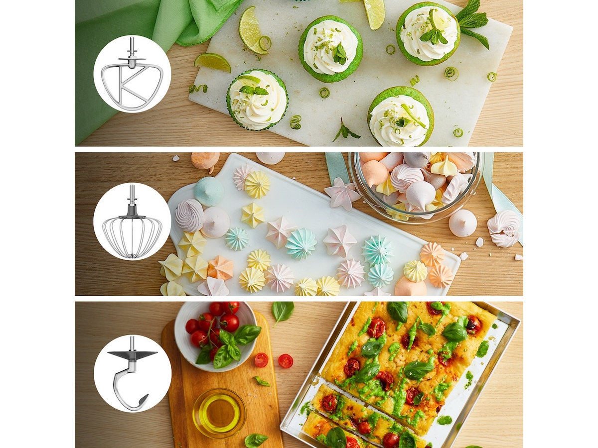 En 4L røreskål, 3 højdejusterbare og målrettede værktøjer og 800w holdbar motor gør det muligt for Go at lave en kage i to niveauer, pizzaer til hele familien eller et brød uden at svede.