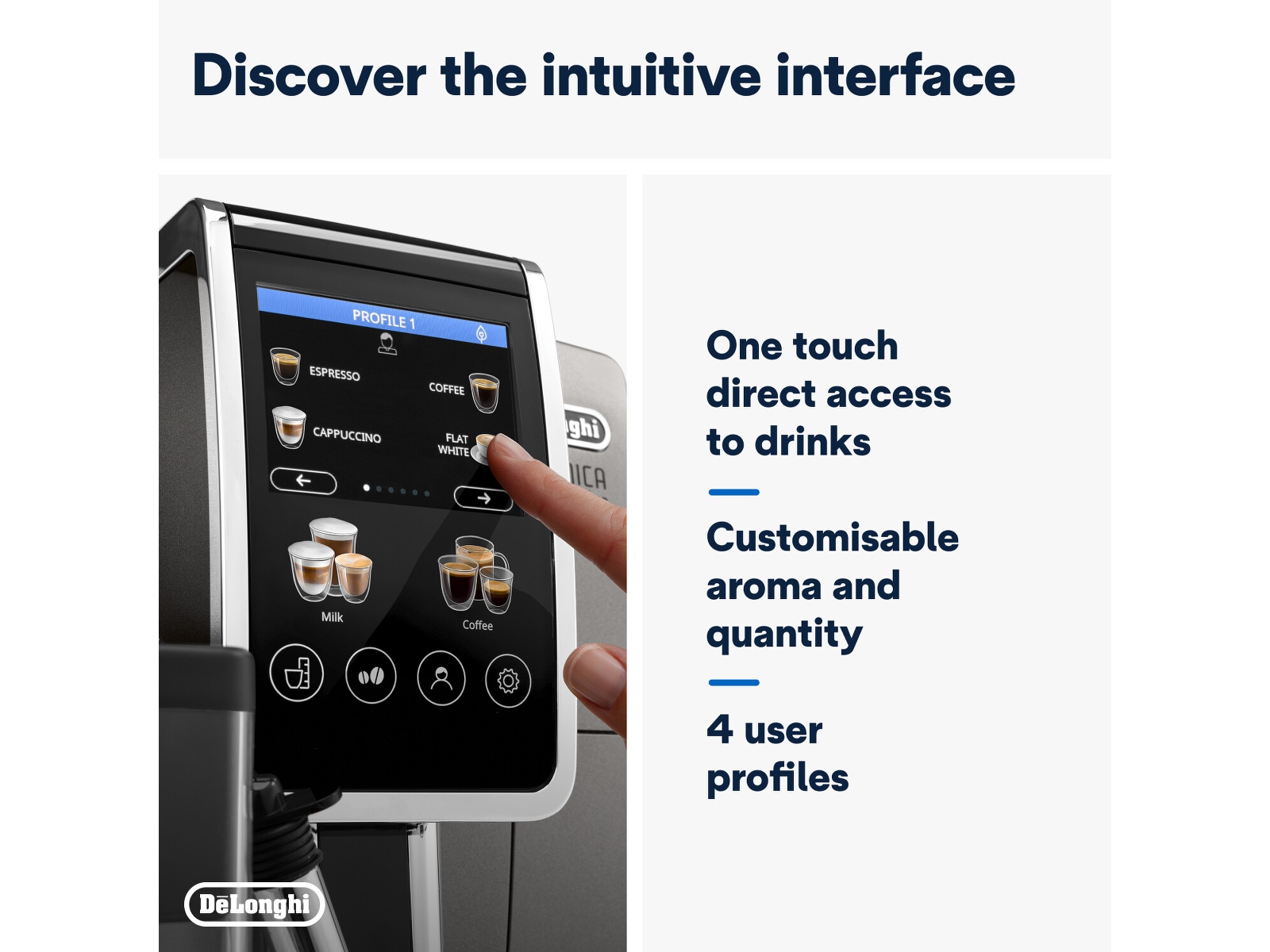 Der er en kaffe til hvert øjeblik af dagen med Dinamica Plus. Vælg mellem 24 drikkevarer tilgængelige i ét tryk gennem det intuitive 3,5" fuld-touch farvedisplay. Udstyret med eksklusiv LatteCrema Hot-teknologi til at toppe dine drinks med fint rigt mælkeskum, med mulighed for at vælge mellem 3 skumteksturer: tæt, cremet eller let.