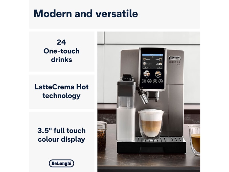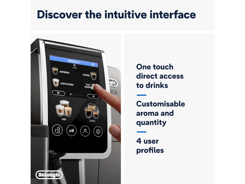 Der er en kaffe til hvert øjeblik af dagen med Dinamica Plus. Vælg mellem 24 drikkevarer tilgængelige i ét tryk gennem det intuitive 3,5" fuld-touch farvedisplay. Udstyret med eksklusiv LatteCrema Hot-teknologi til at toppe dine drinks med fint rigt mælkeskum, med mulighed for at vælge mellem 3 skumteksturer: tæt, cremet eller let.