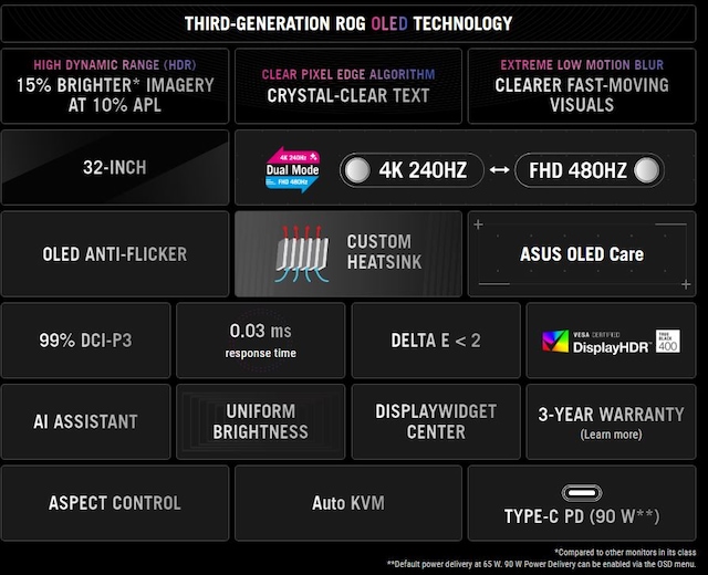 ROG Swift OLED PG32UCDP gaming-skærm ― 32-tommer (31,5 tommer synligt) WOLED-panel, dual mode (4K 240Hz eller FHD 480Hz), 0,03 ms (GTG), G-SYNC®-kompatibilitet, tilpasset heatsink, ASUS OLED Care, AI Assistant, VESA DisplayHDR™ 400 True Black, ensartet lysstyrke, 99 % DCI-P3, ægte 10-bit farve, Type-C® (90 W PD) og DisplayWidget Center