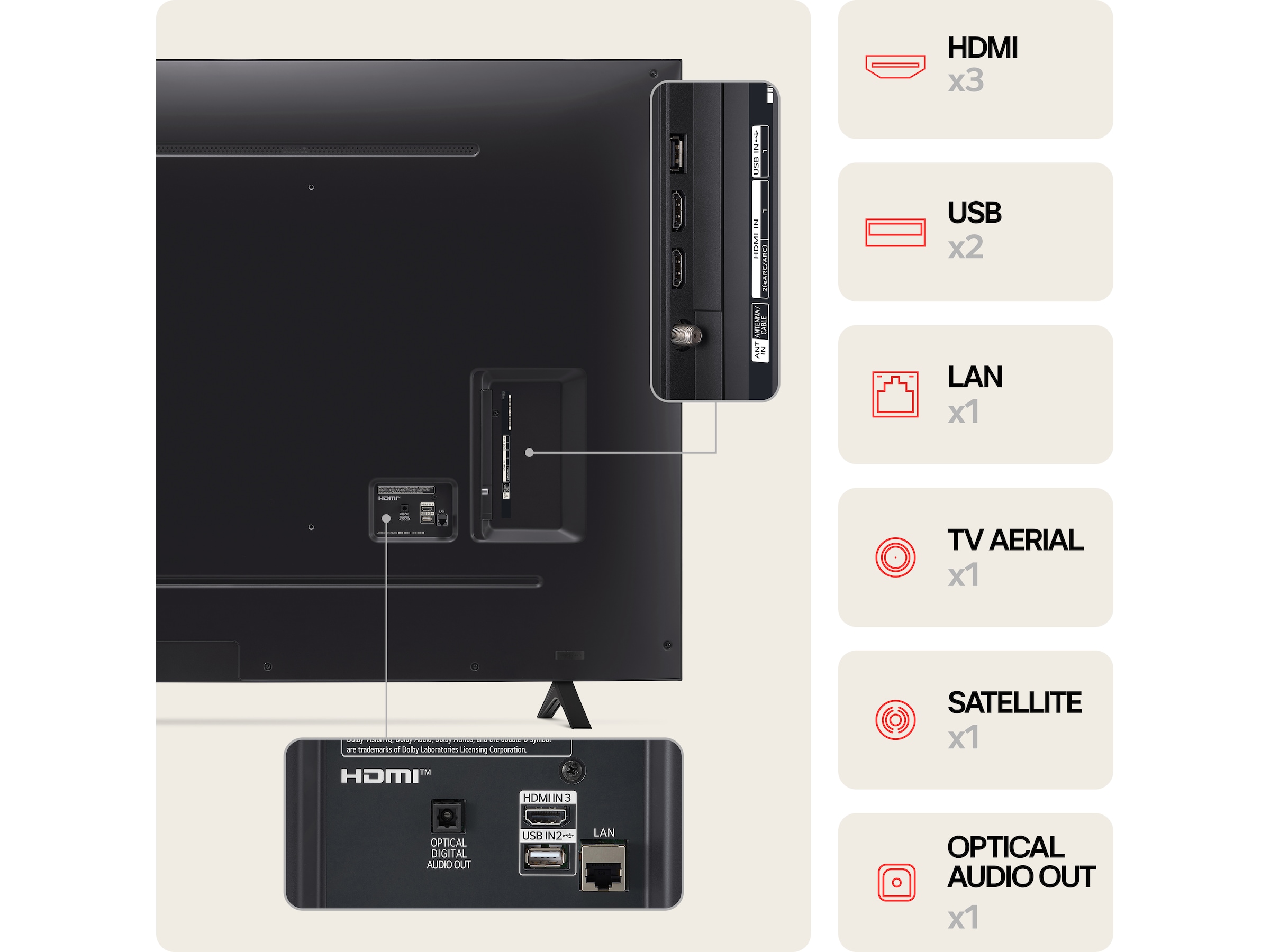3 x HDMI, 2 x USB 2.0, LAN, Digital lydudgang (optisk) |