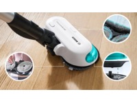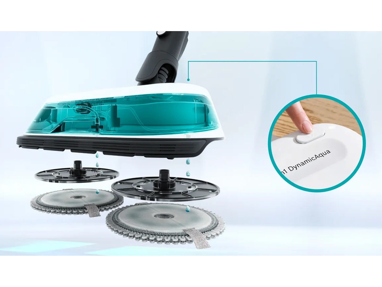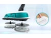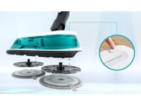 2 i 1 DynamicAqqua Mop kombinerer kraftig støvsugning gennem sugekanalen med grundig mopping ved hjælp af to Spinning Pads. Disse aktivt roterende puder holdes konstant våde takket være det automatiske vanddoseringssystem, der altid sikrer den rette mængde fugt på puderne. Selv vanskelige pletter fjernes nemt. Puderne fjerner al slags snavs fra næsten alle typer hårde gulve som vinyl, sten, fliser og endda forseglede trægulve.
