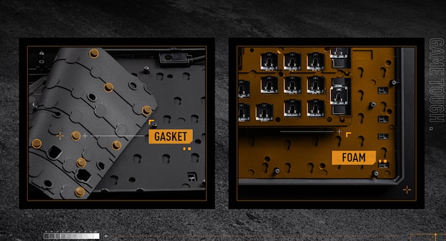 ASUS TUF Gaming K3 Gen II har et gennemtænkt design, der anvender en silikonepakningsmontering for at minimere vibrationer og giver en mere polstret og behagelig skrivefornemmelse. Integreret dæmpende skum absorberer pinglyde og ekko yderligere for mere støjsvage tastetryk.