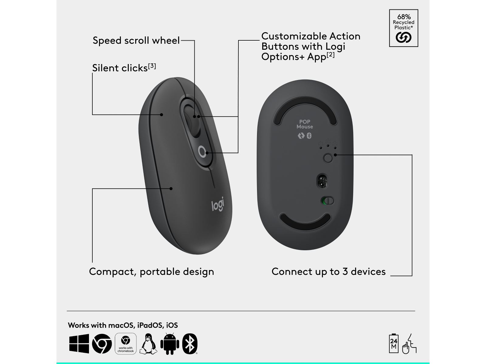 | Egenskaber | SilentTouch-teknologi, High Precision Optical Tracking, Easy-Switch teknologi, Programmerbar topknap, 3 enheder simultan forbindelse, Logitech Flow, SmartWheel, Auto-dvaletilstand |