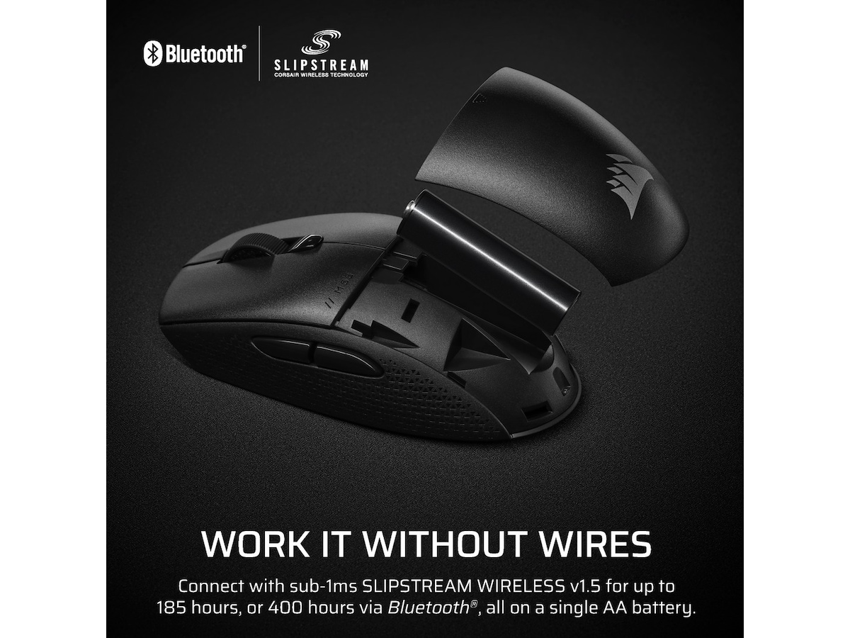 M55 TRÅDLØS er en fornøjelse at manøvrere hurtigt rundt uden ledninger. Dens trådløse forbindelse er lige så smidig og sender input med næsten nul forsinkelse via SLIPSTREAM WIRELESS v1.5 eller alsidig Bluetooth®. M55 TRÅDLØS har en trådløs batterilevetid, der bare ikke stopper, og den varer op til forbløffende 185 timer på et enkelt AA-batteri.*