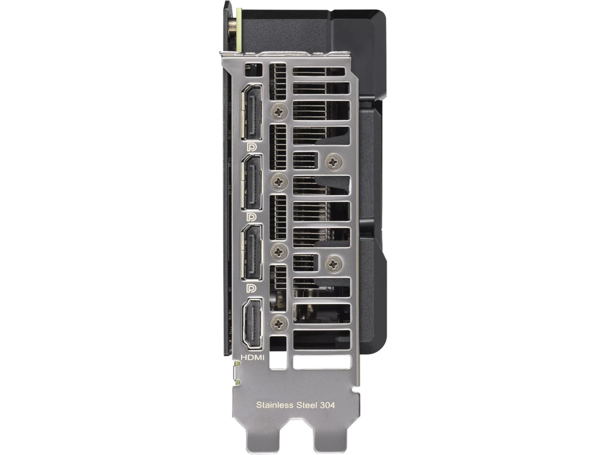 PCB'en er forstærket med en aluminiumsbagplade, der tilføjer strukturel stivhed, hjælper med at forhindre bøjning og beskytter komponenter og trace-pathways mod skader. Bagsiden har en bred åbning, der tillader varm luft at slippe ud i retning mod chassisets udstødningsventilatorer i stedet for at blive genbrugt tilbage i GPU-køleren.