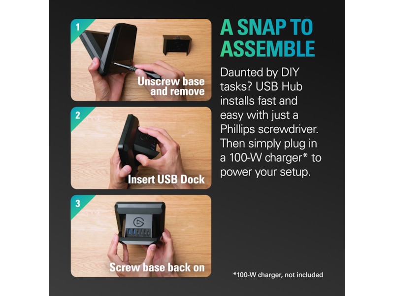 Mangel på havne? Nu fungerer Stream Deck + også som en USB-hub. På bagsiden kan du tilslutte op til fire enheder, fra eksterne enheder til eksterne harddiske. Den forsyner også din bærbare computer, og frigør den port, du normalt bruger til opladning. Overfør filer hurtigt med hastigheder på op til 5 Gb/s via USB-C, eller brug den praktiske SD-kortlæser på siden. USB-hub skjuler og skjuler kabler og holder arbejdsområdet ryddeligt. Derudover er dine porte altid inden for rækkevidde, og den monteres på få sekunder – ingen drivere er nødvendige. Alt hvad du behøver for at udvide og strømline din opsætning, alt sammen fra én enhed.