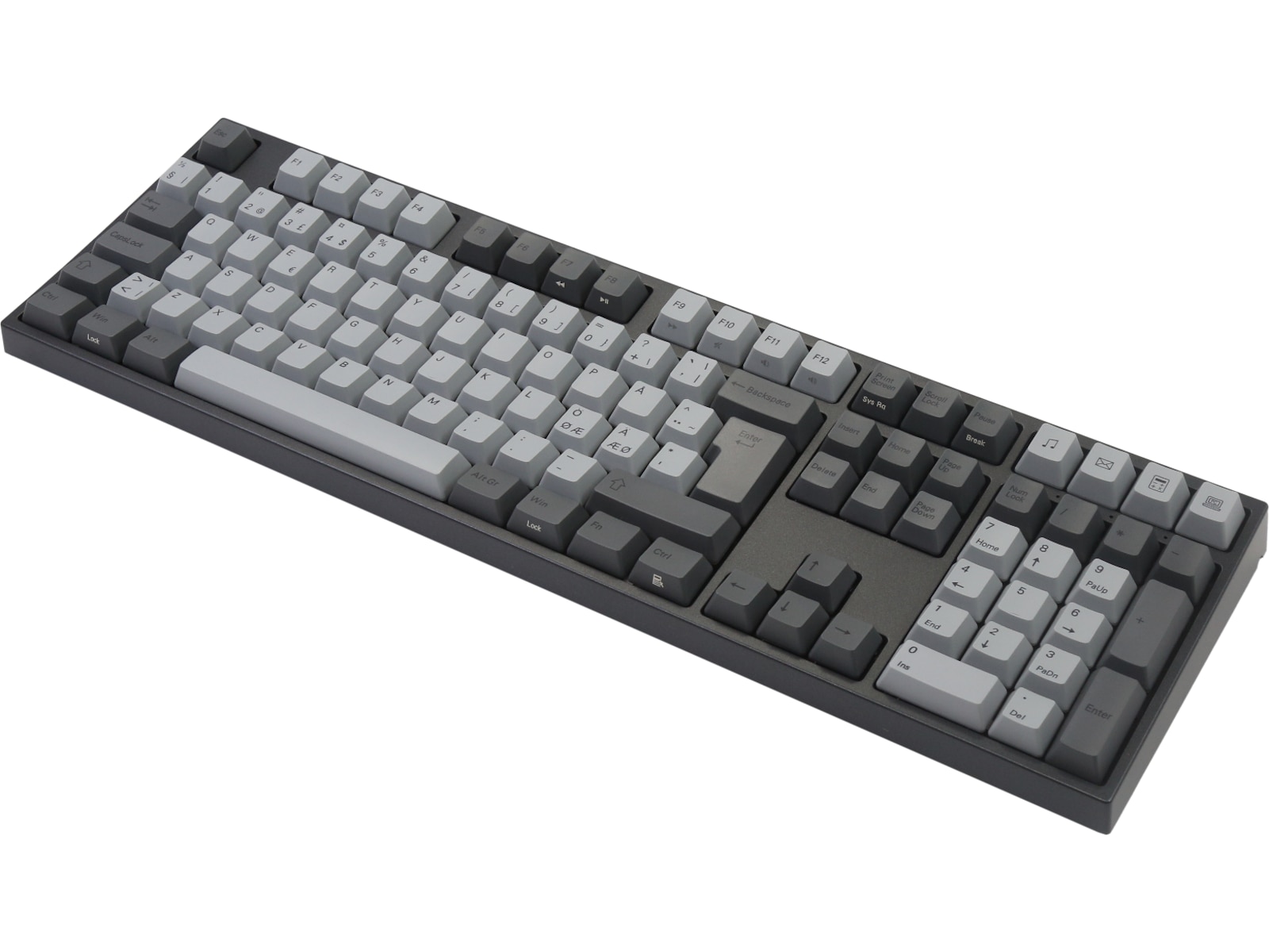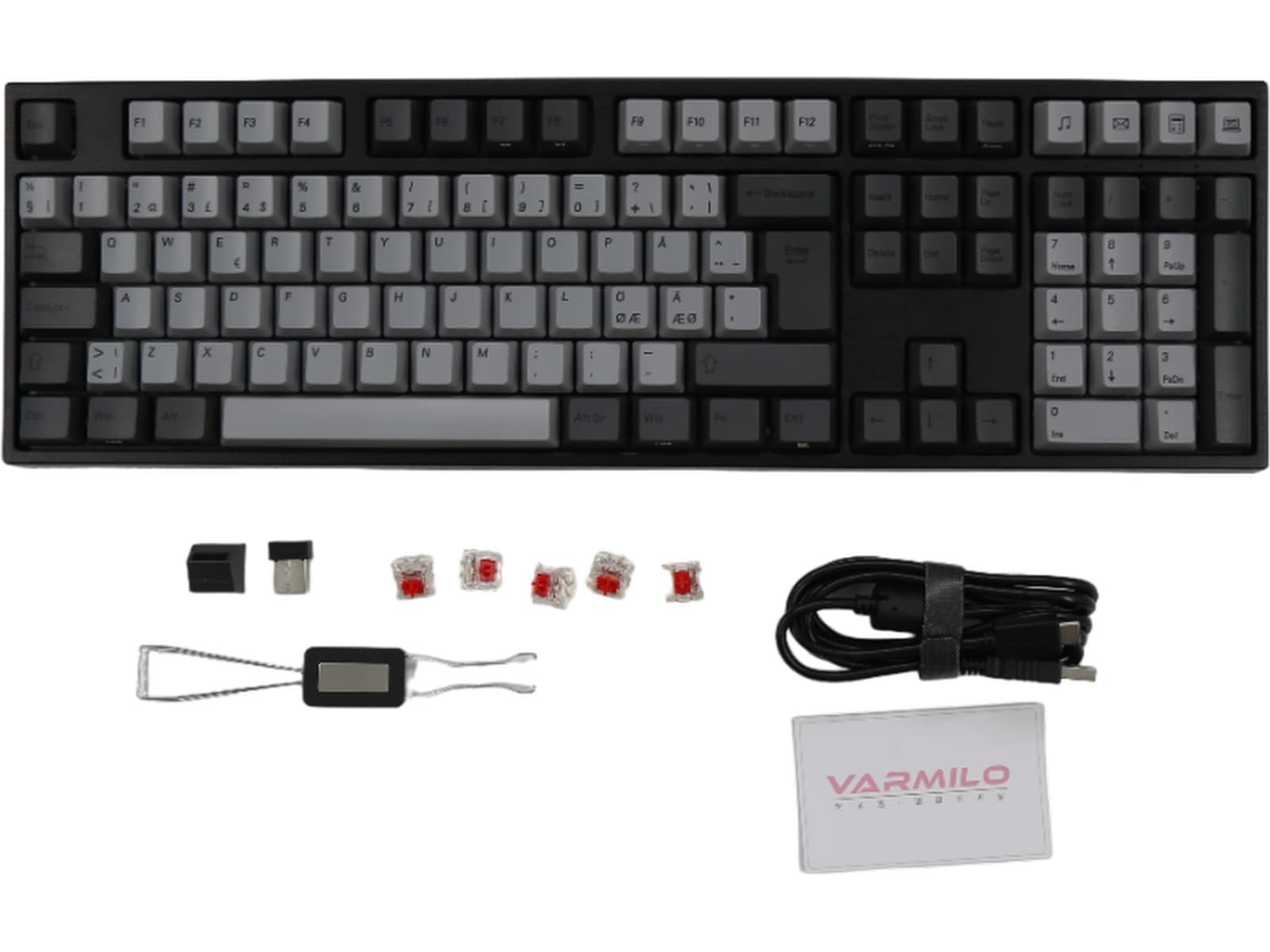 Billige keycaps holder ikke længe, og bogstaverne, der er trykt på dem, falmer over tid. Varmilos keycaps er lavet af PBT-plast, som er slidstærkt. Bogstaverne på keycaps er lavet af forskellige typer plast og er støbt direkte på tasterne. Derfor falmer de aldrig.