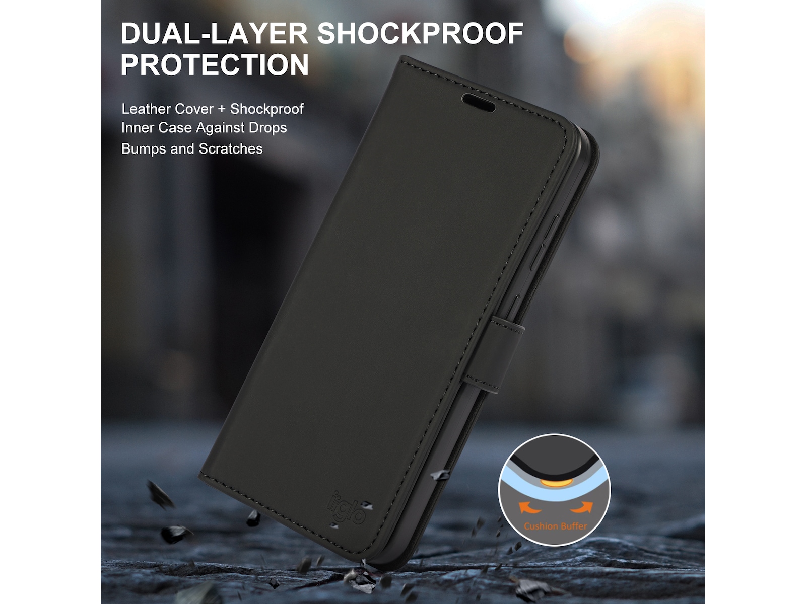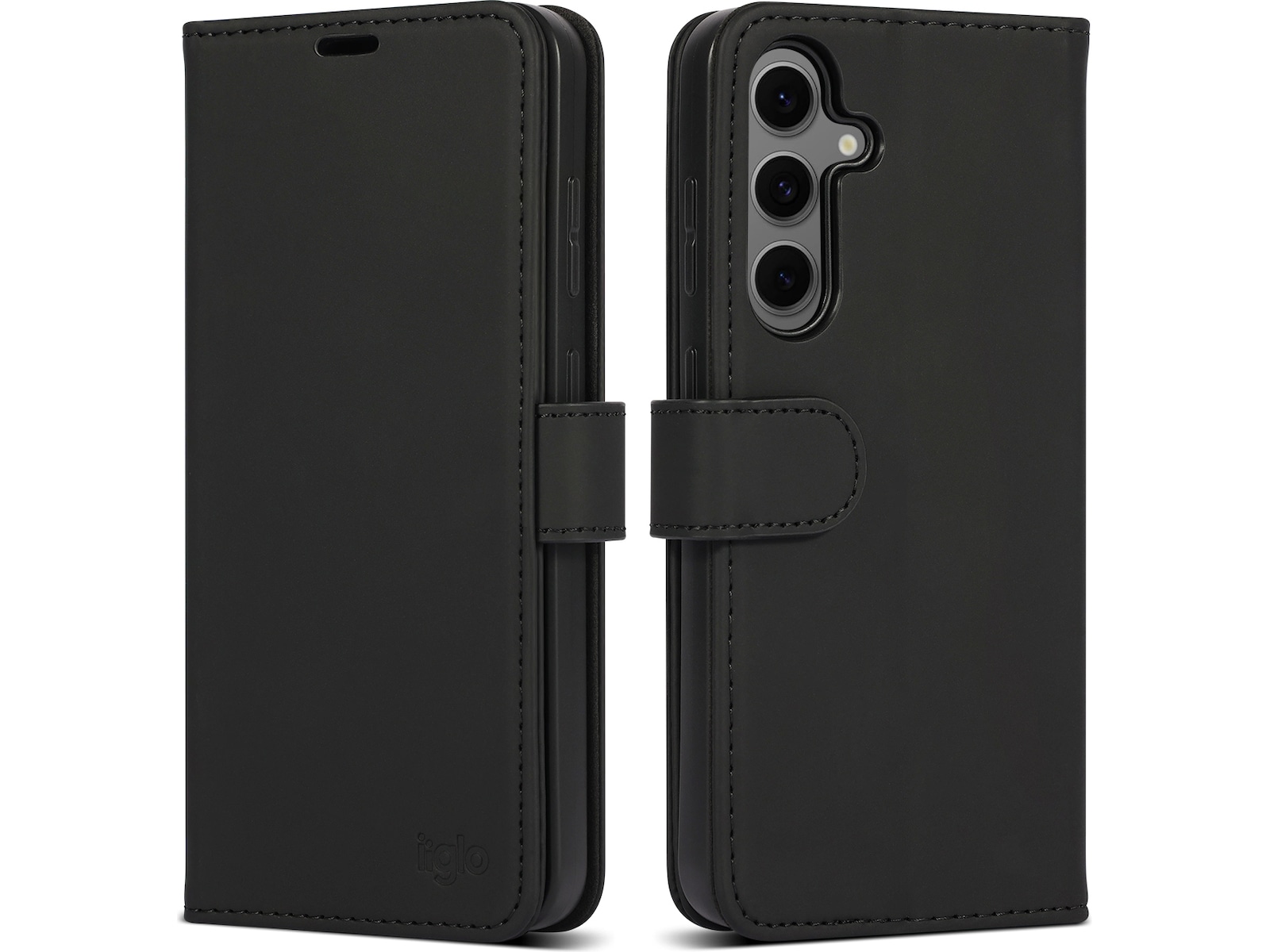 Beskyt din telefon med iiglo tegnebogsetui i sort design Dette etui er lavet af førsteklasses PU-læder, der er et blødt og slidstærkt materiale. Etuiet beskytter mod stød og ridser. Den magnetiske strop sikrer, at etuiet lukkes, selv når telefonen er i jakkelommen eller PC-tasken.