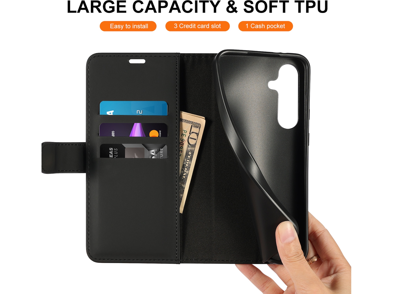 Etuiet er meget let og giver god holdekomfort, når du bruger din smartphone. Fronten kan foldes til et stativ, så du kan se film eller deltage i videomøder i en perfekt vinkel! Etuiet har en lomme til tre kort. Selv med praktiske løsninger er der ikke gået på kompromis med designet, som er sort, enkelt og stilfuldt.