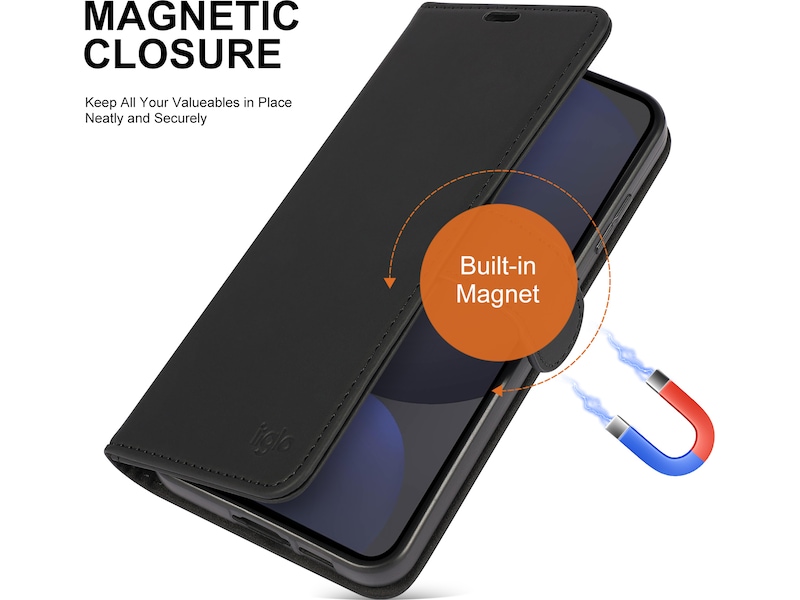 Beskyt din telefon med iiglo tegnebogsetui i sort design Dette etui er lavet af førsteklasses PU-læder, der er et blødt og slidstærkt materiale. Etuiet beskytter mod stød og ridser. Den magnetiske strop sikrer, at etuiet lukkes, selv når telefonen er i jakkelommen eller PC-tasken.