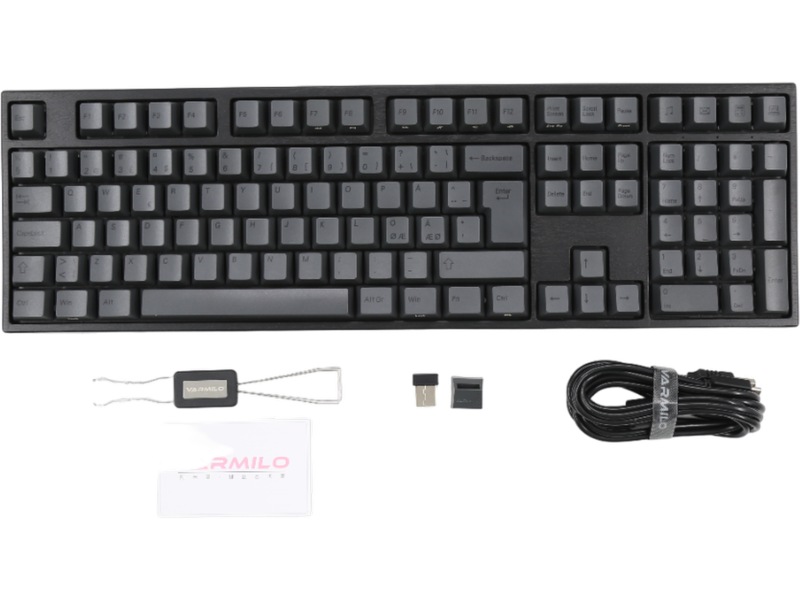 Billige keycaps holder ikke længe, og bogstaverne, der er trykt på dem, falmer over tid. Varmilos keycaps er lavet af PBT-plast, som er slidstærkt. Bogstaverne på keycaps er lavet af forskellige typer plast og er støbt direkte på tasterne. Derfor falmer de aldrig.