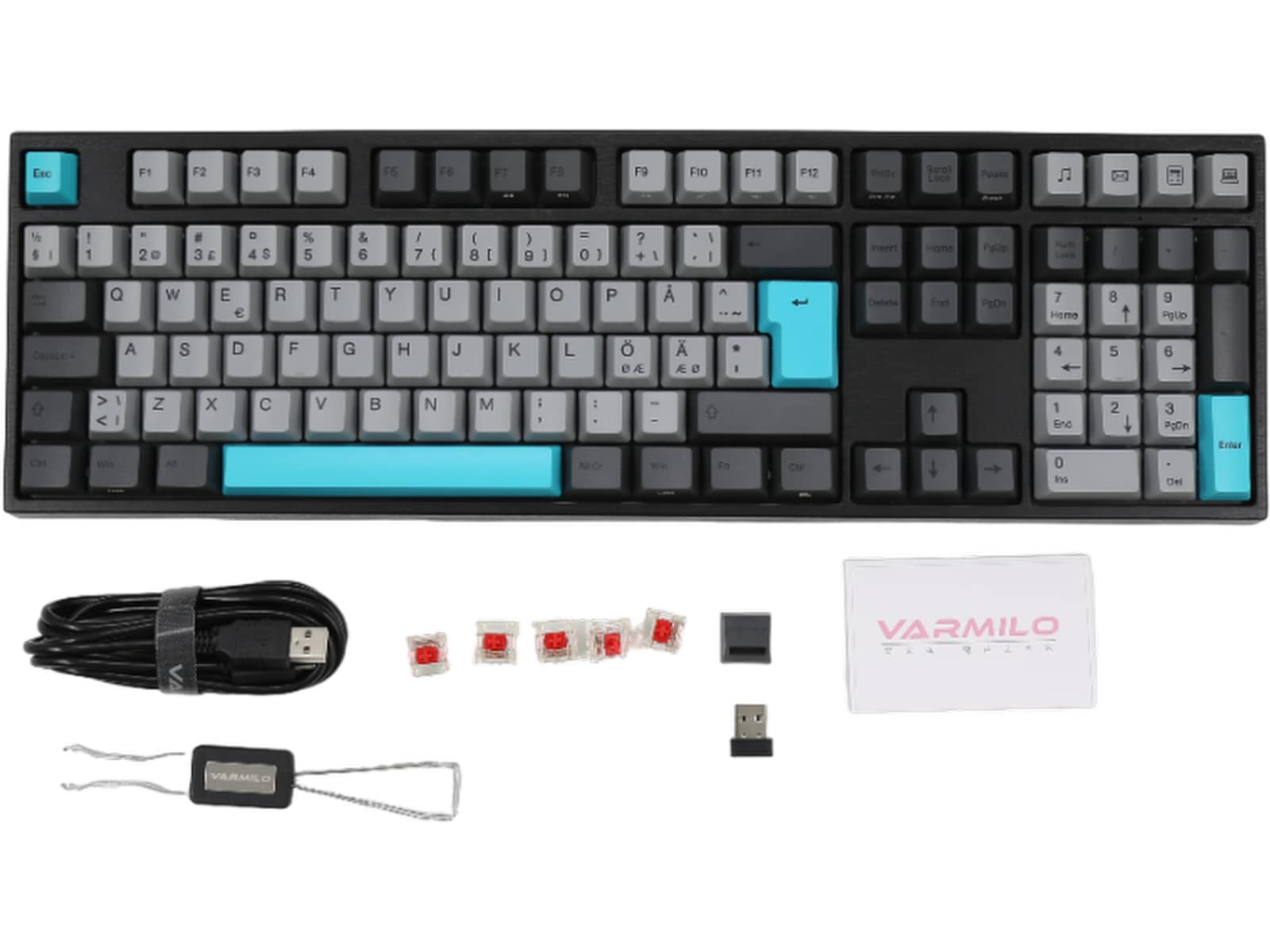 Billige keycaps holder ikke længe, og bogstaverne, der er trykt på dem, falmer over tid. Varmilos keycaps er lavet af PBT-plast, som er slidstærkt. Bogstaverne på keycaps er lavet af forskellige typer plast og er støbt direkte på tasterne. Derfor falmer de aldrig.